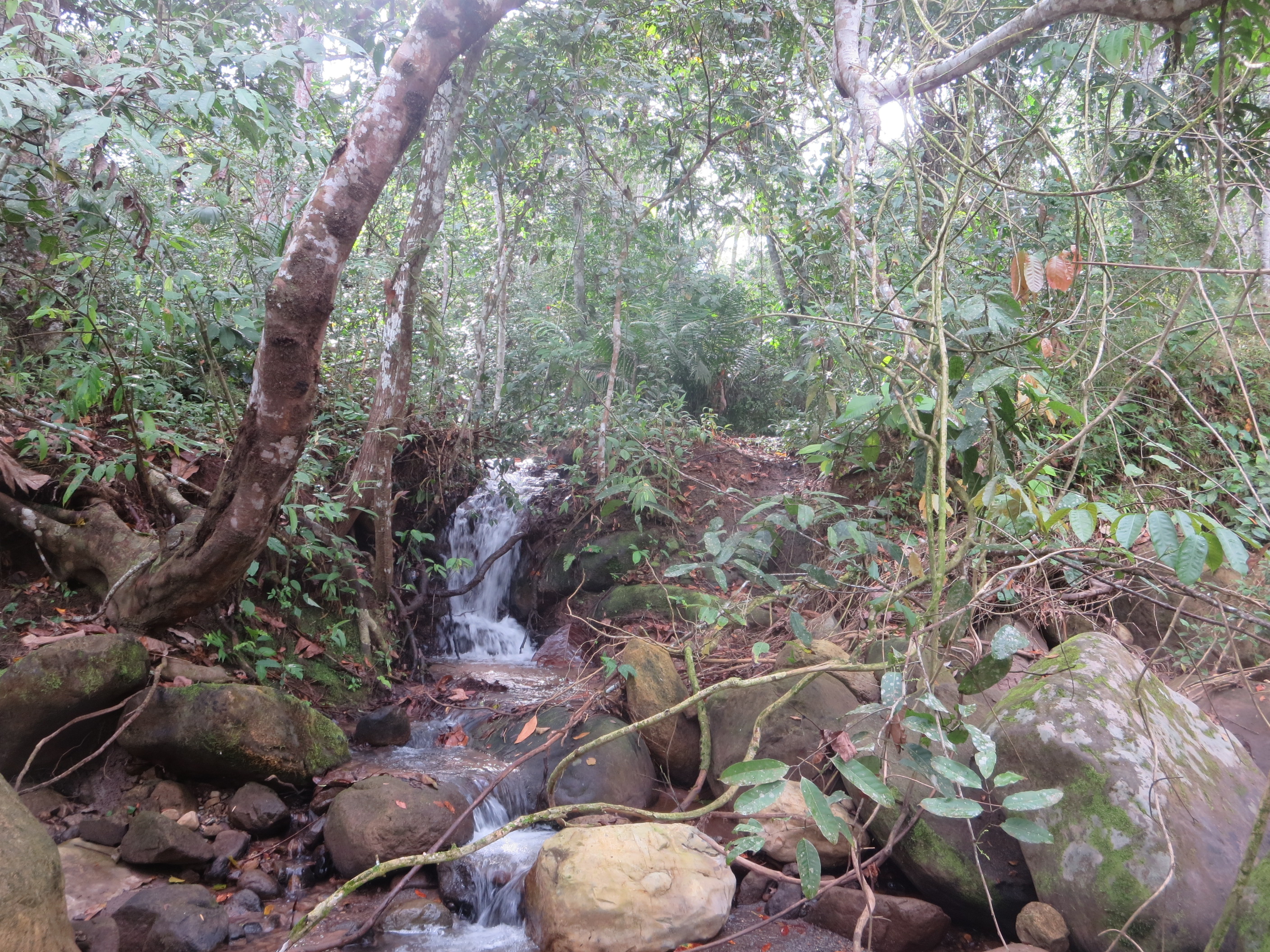 The dirt road follows the river up, all the way to the Escalara nature reserve, passing lodges, thicker forest, hilly farm, swampy bog, and small cascades among big rocks. Mototaxis zoom by, a 15-minute ride, but it’s more fun to run and hide among the shadows as night approaches.