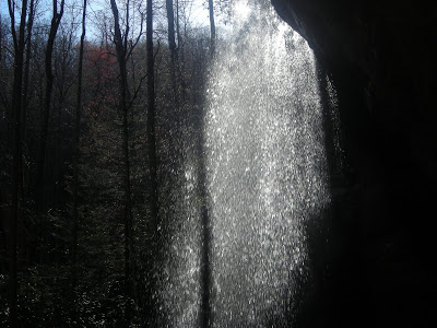 Moore’s Cove Falls (both pictures above and below) is about a half-mile hike from the road: smaller, much more private, and you can go behind the waterfall and sit and stay dry!