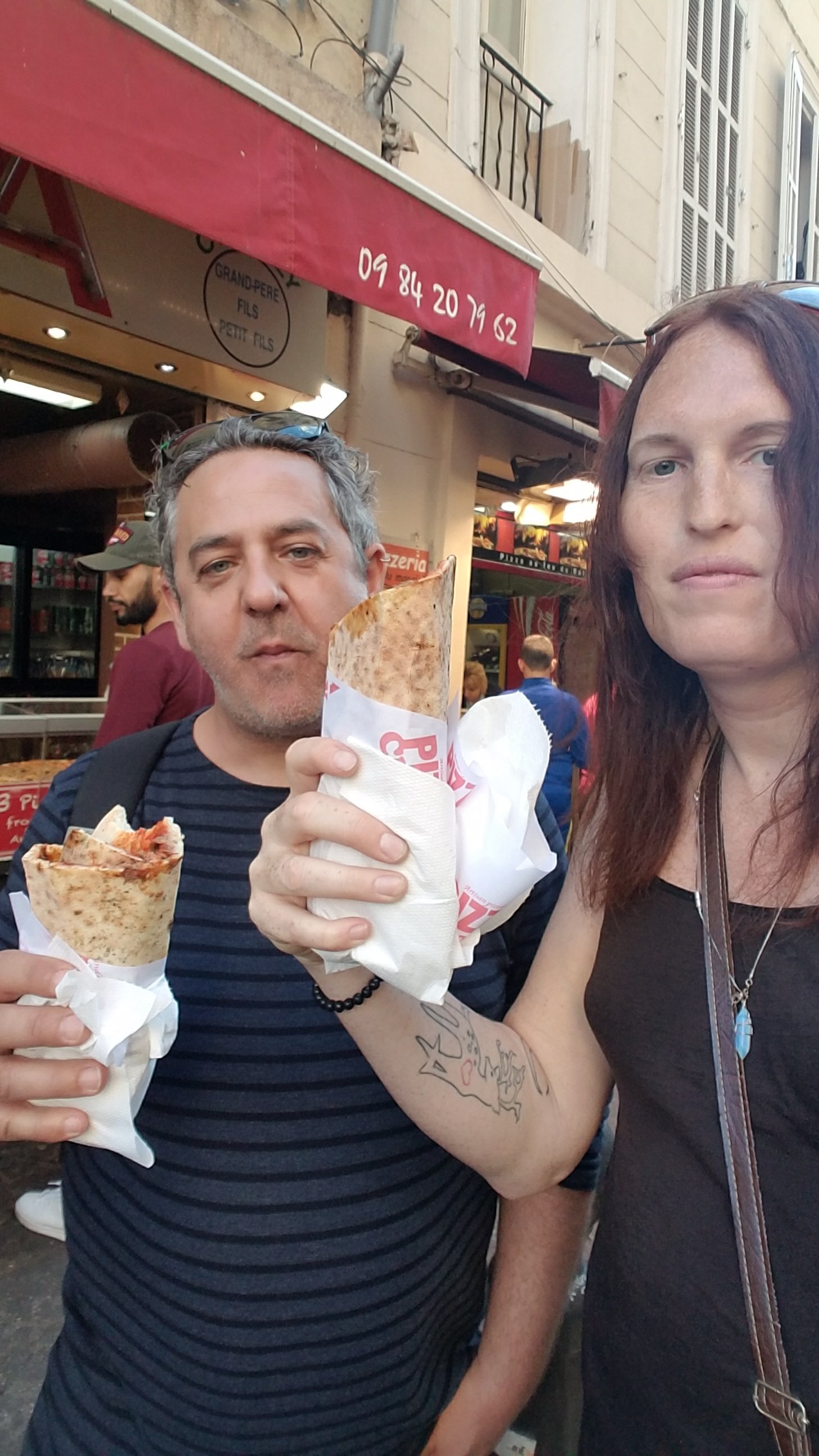 On my third day, I visit another market, the Marché de la Plaine by the Champ du Mars alley with some more street art, and a trans woman comes up to me. She’s been sleeping on the beach and hasn’t eaten in two days, and today is her birthday. So i buy her a slice of quiche and she takes me to an LGBT center, where today they are open and offering breakfast and health services. It is neat to be a guest here with the queer community of Marseille.