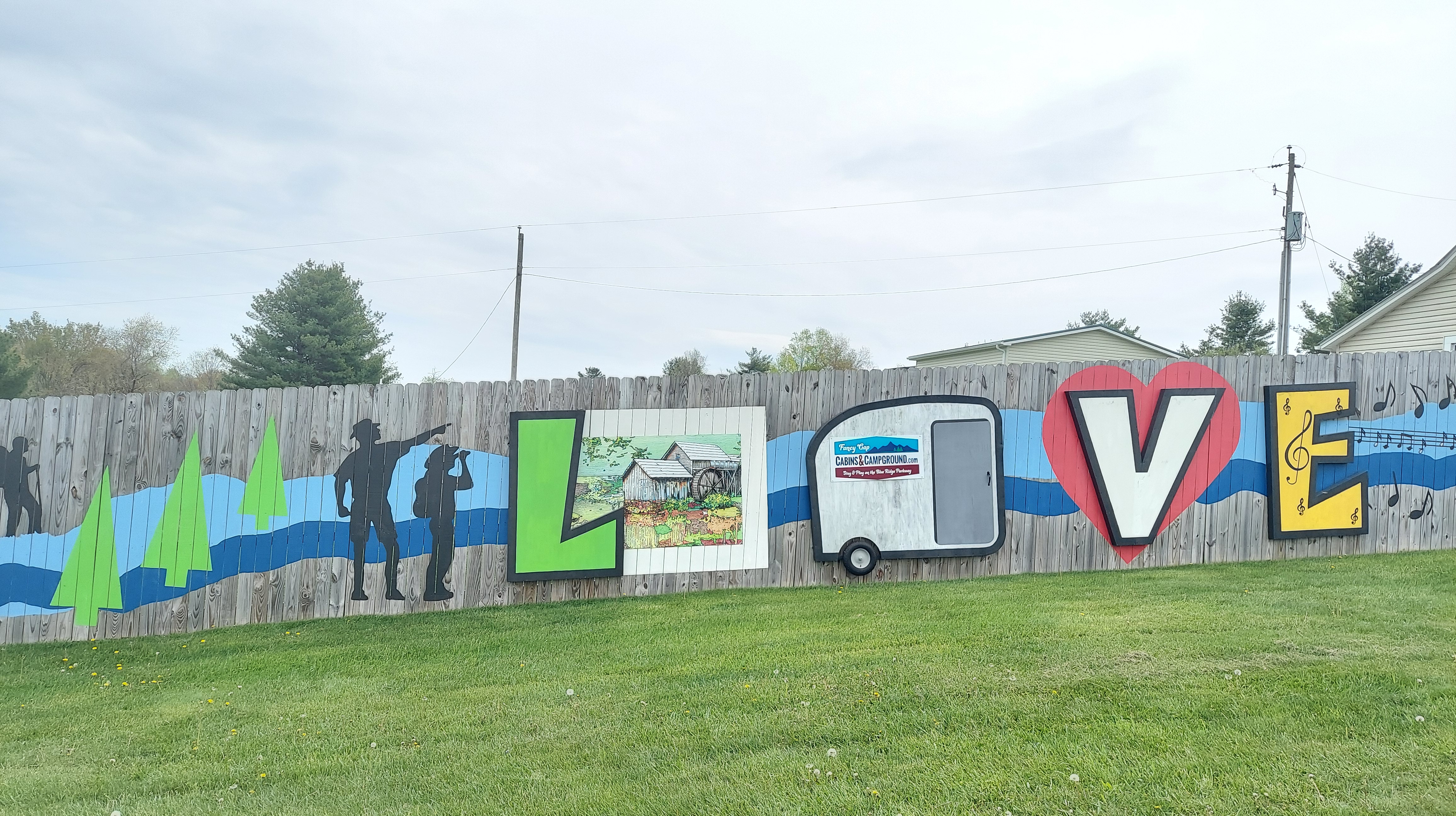 We camped this time at Fancy Gap Cabins and campground, just off the Blue Ridge Parkway west of the gap. It has a tent area, RV sites, cabins as the name suggests, and a small hotel. There is an apple and a peach orchard and a short hiking trail on site. At the entry, one is greeted by the mural on the fence in the photo below. We enjoyed our experience here and recommend to anyone visiting or just passing through along the Fancy road.