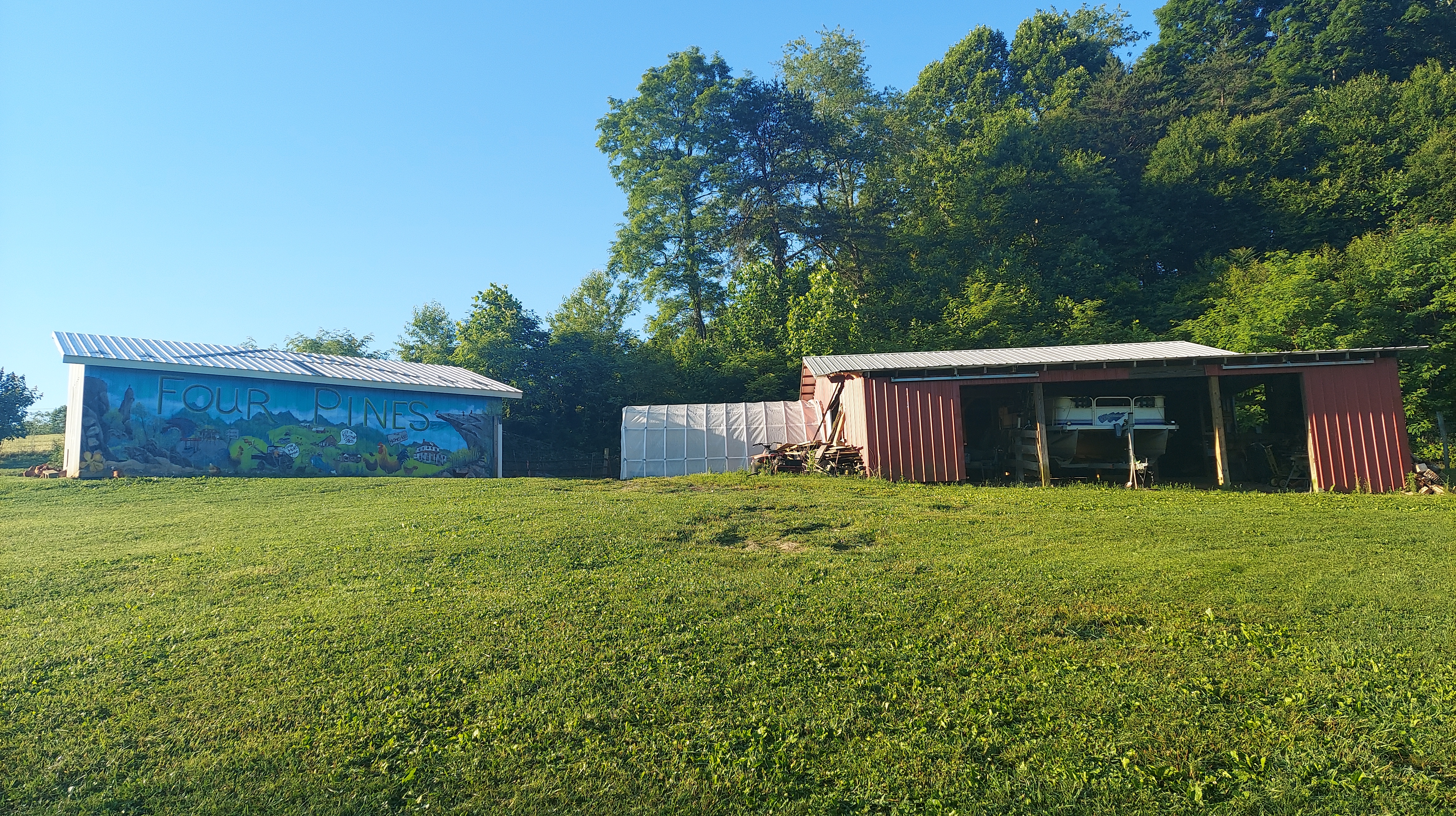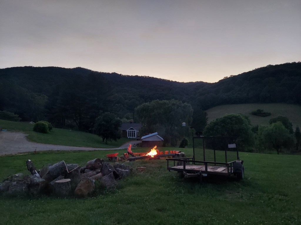 At this time of year, the hostel is busy with AT thru-hikers. The main area, a converted garage with bunk beds, couches, outlets, a kitchen, and bathroom with shower, is full (understandably), and there are also some tents set up around the flat spots on the grassy hillside, so I put my bedding where I stayed in 2018: the upper storage barn. There are two cots, but I am the only one in here. Overnight, the grass becomes wet with dew and the roosters crow before the sun.