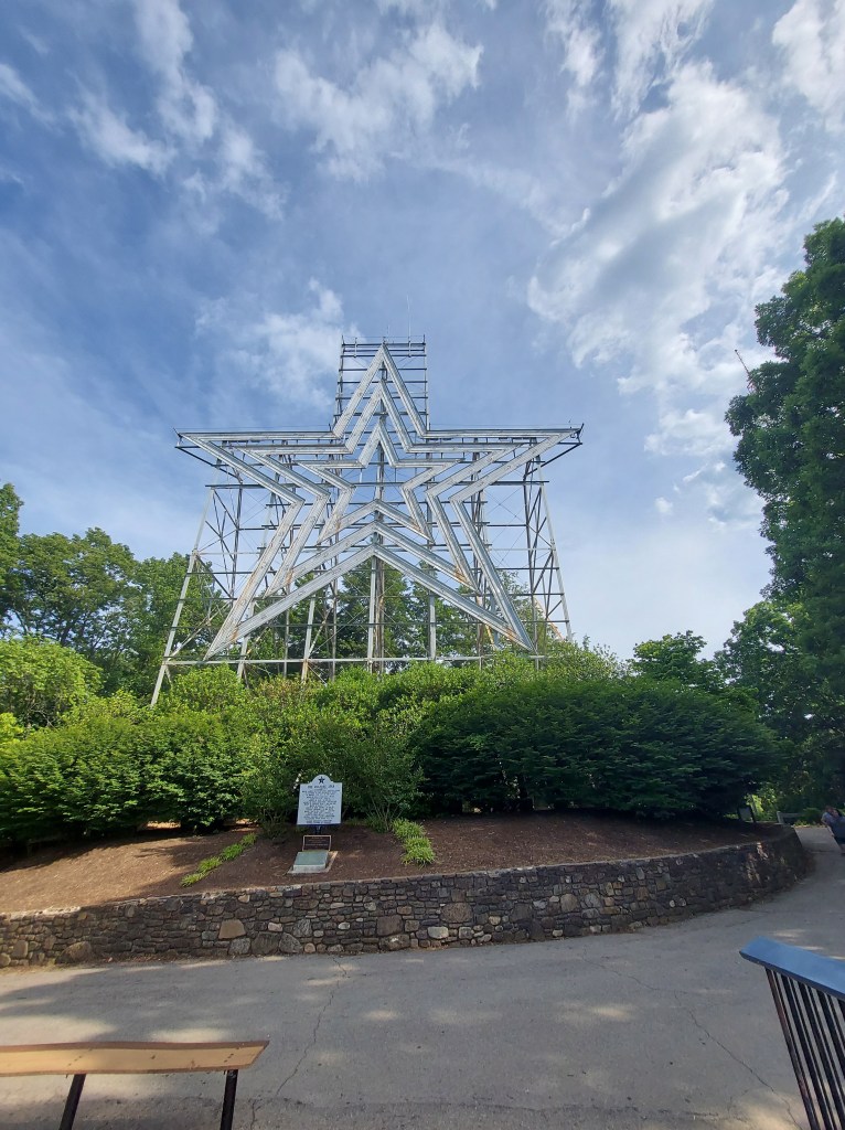 Mill Mountain/ Star: the city’s most well-known attraction. Immediately south of downtown, this edge of the Blue Ridge overlooks the valley. The earth’s largest human made star lights up after dark (appropriately) but I don’t stay late enough to see that. I do see a friendly deer by the star I walk around a short trail. The summit of Mill Mountain can be reached by car, bike or by foot trail, and it’s free to visit. I’m sure sunsets are amazing here. By late afternoon, plenty of people are arriving and the parking lot is filling up, so I leave by way of the Blue Ridge parkway, which passes near here and is easily accessible.