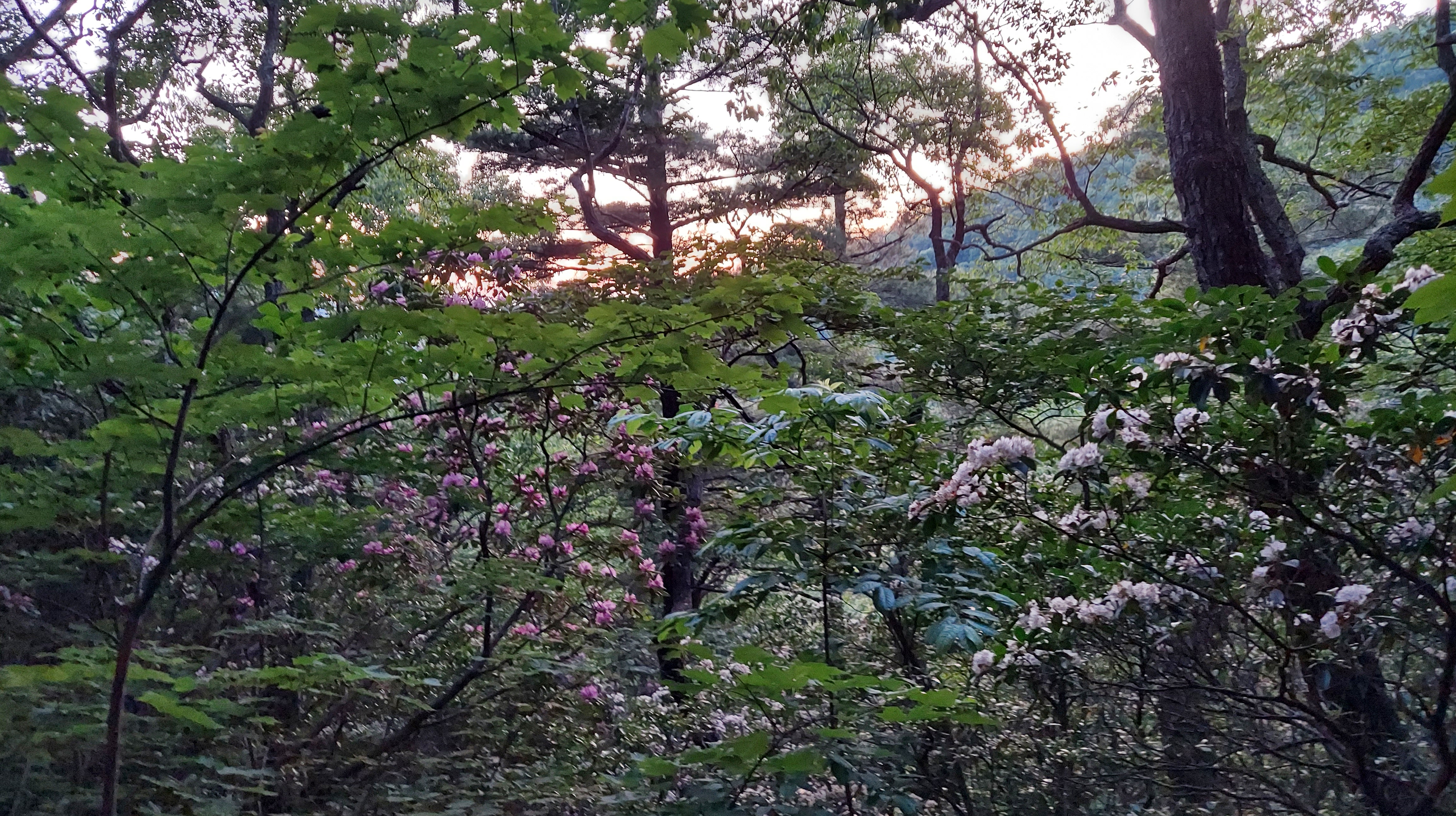 Though views are gorgeous, twilight comes quickly here, and there is enough time for one short hike. Fallingwater trail, toward the west, is easily accessible and the white blooms of mountain Laurel charm me from the first bend. But the sound of rushing water from the hollow below beckons me to walk further, and soon begins the awesome pink-purple array of flowering Rhododendron Catawbiense… the ecstasy of Appalachia in June.