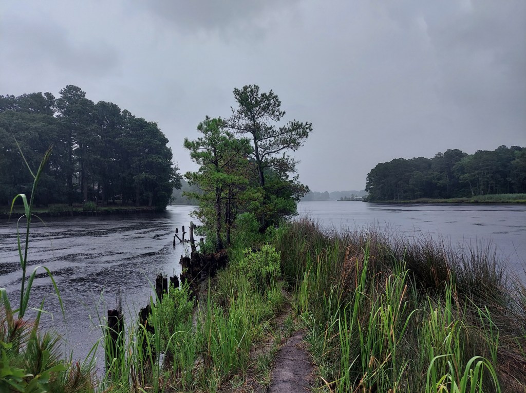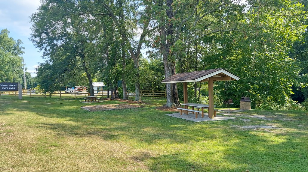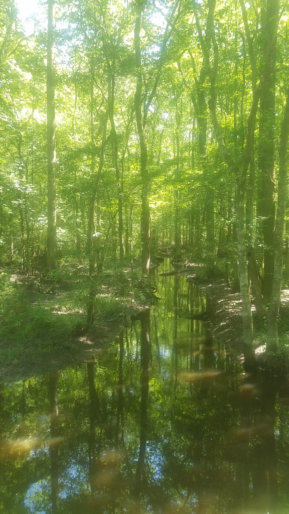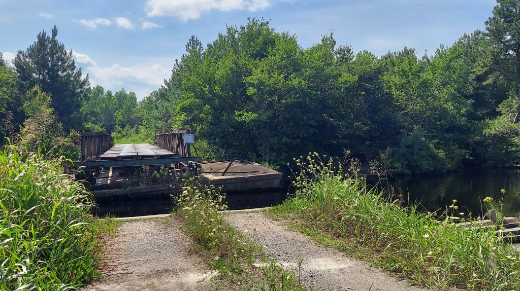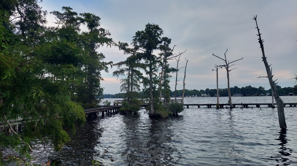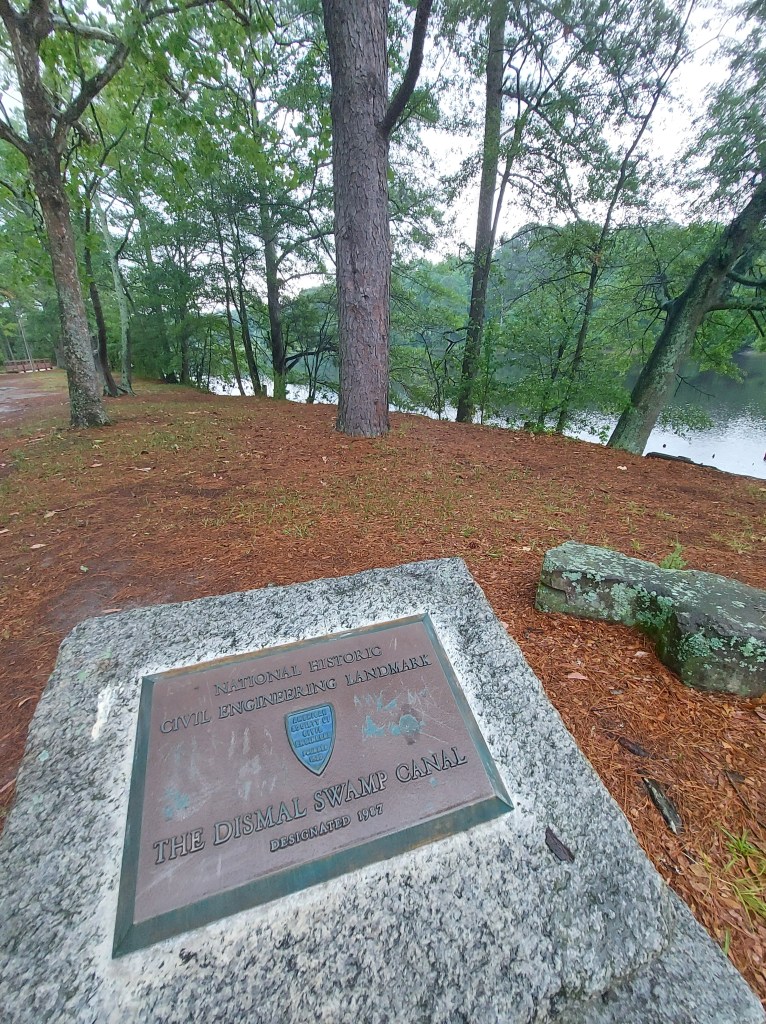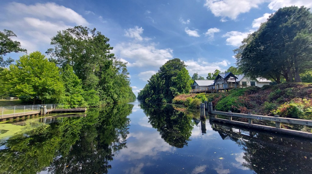 Yellow flies surround me as I walk through thick, humid air and sunlight, to a picnic table to write notes on the way to a gig in Elizabeth City. I’m near the North Carolina-Virginia line. Beside me is the yellow silt-tinged dark Dismal Swamp canal, a 22-mile waterway hand-dug mostly by enslaved laborers over 200 years ago through the Great Dismal Swamp, connecting the Chesapeake bay to the north and the estuaries to the south.