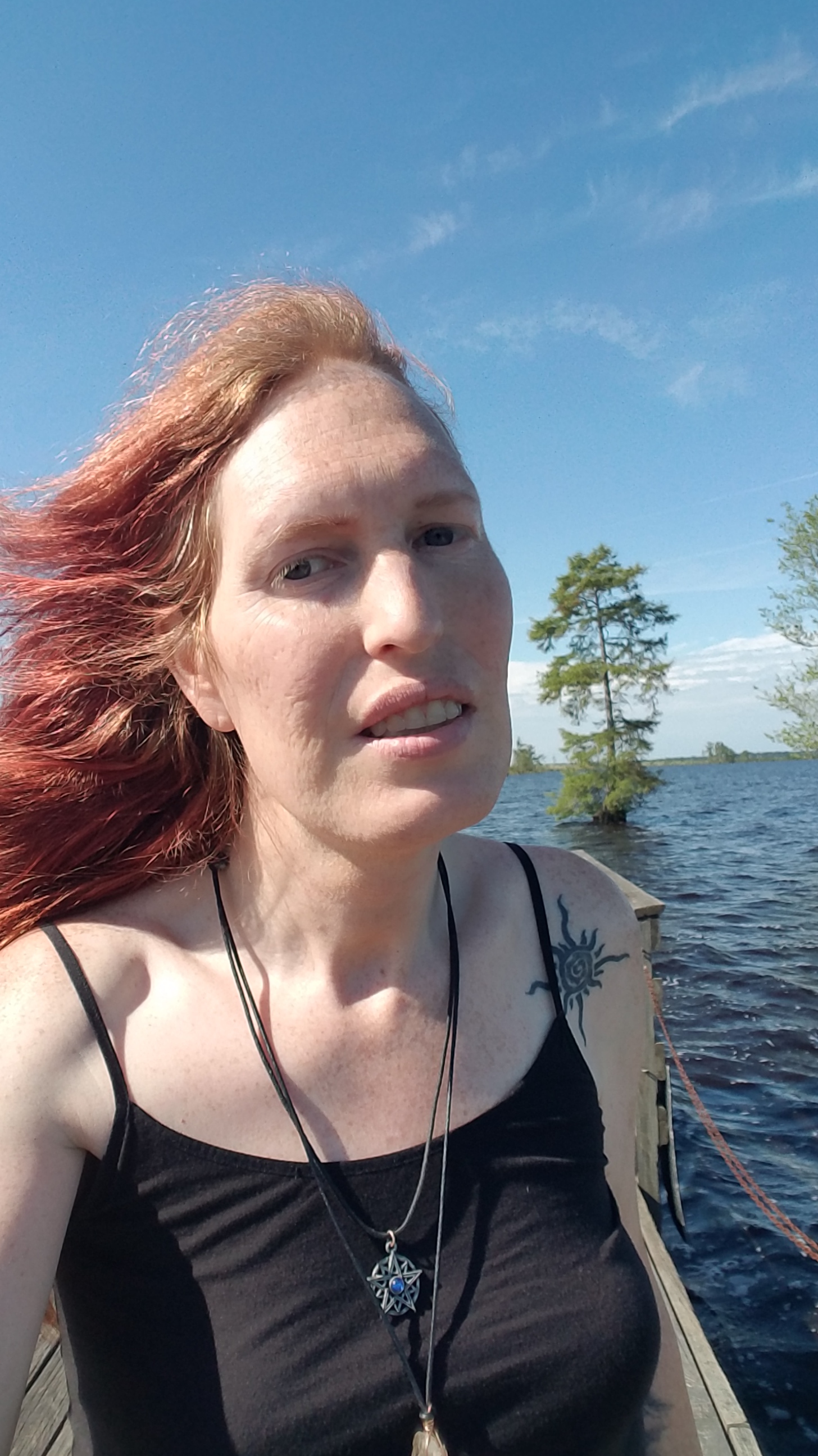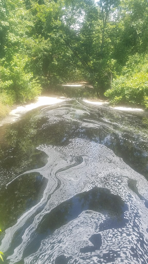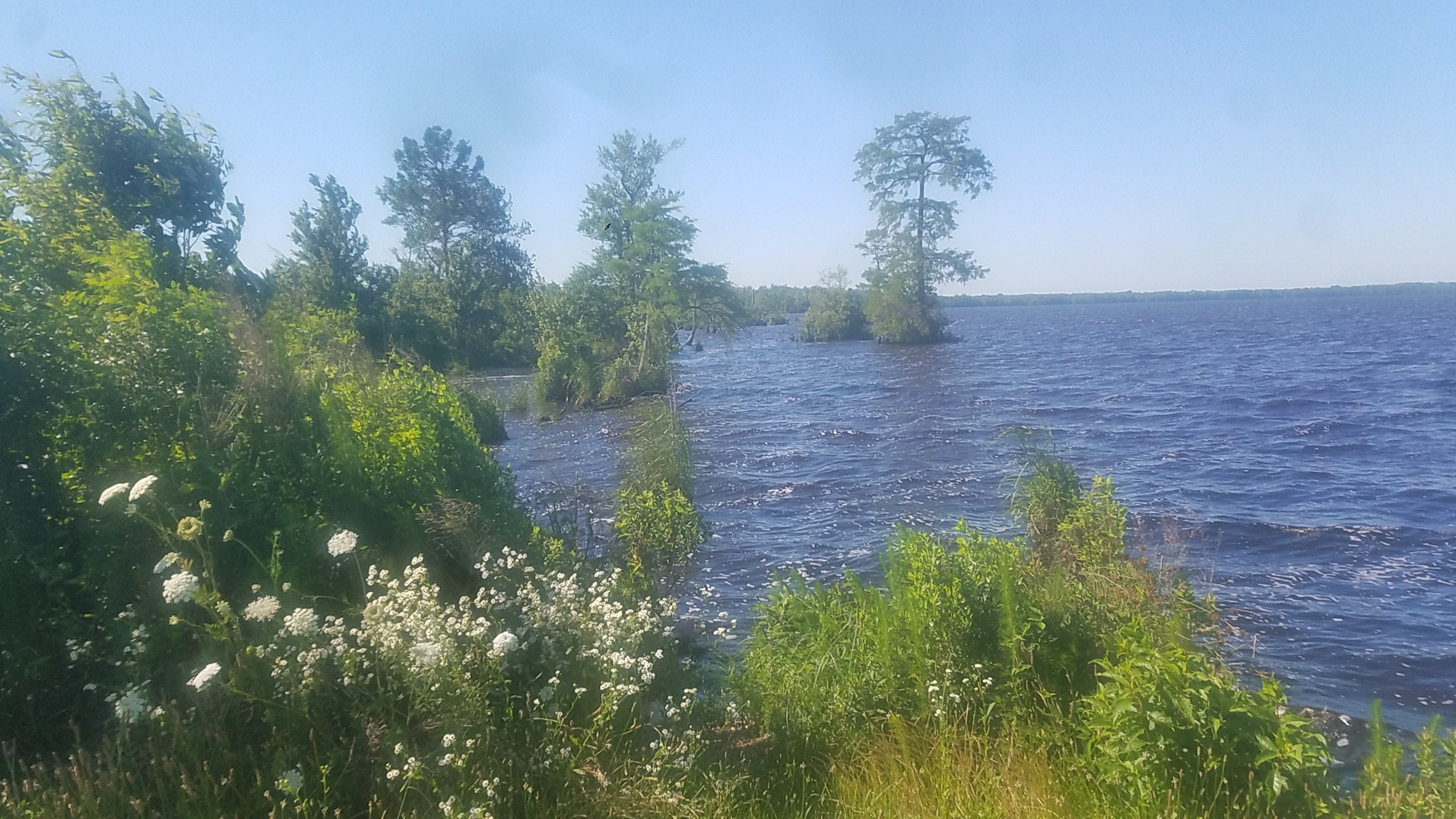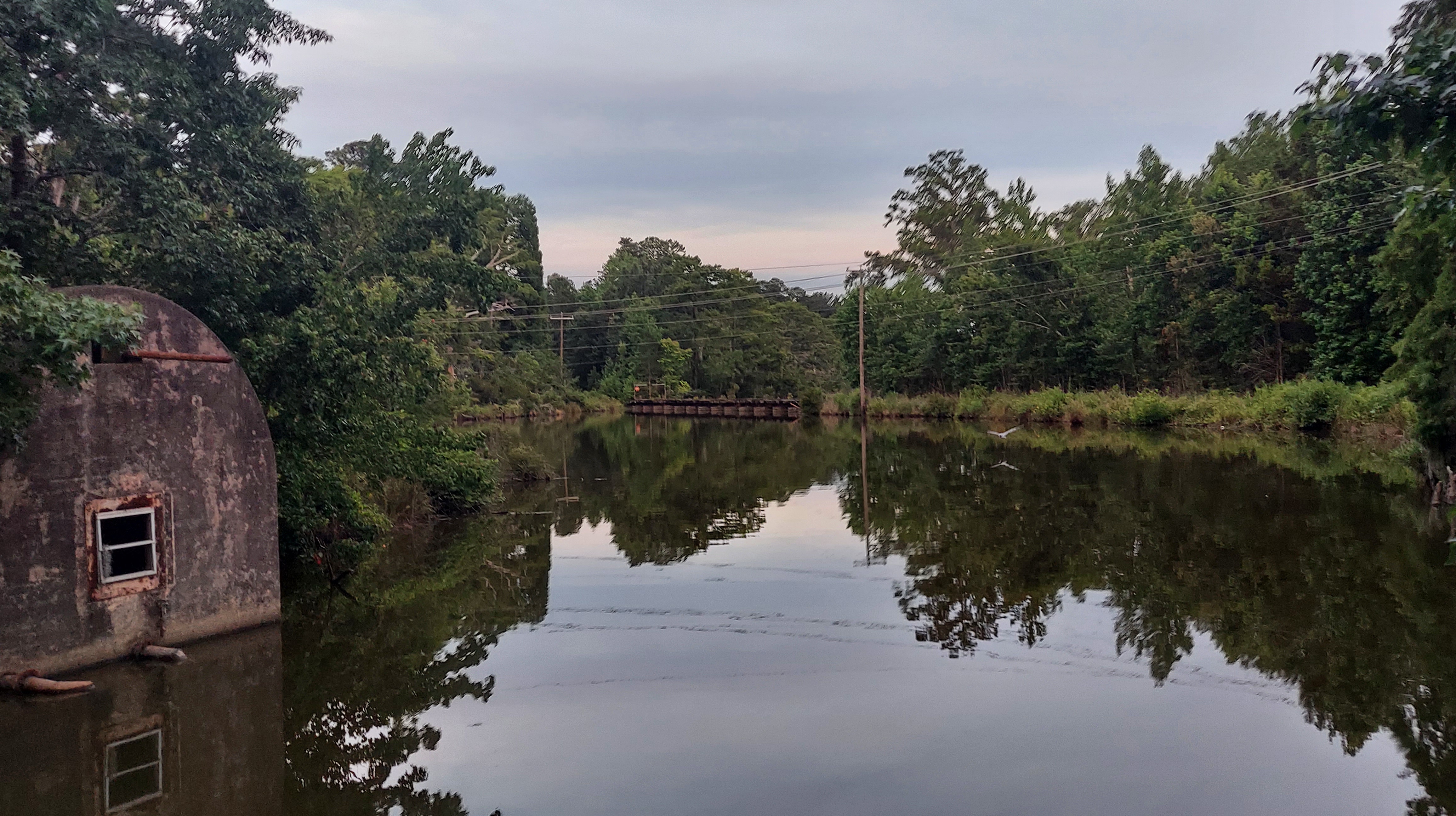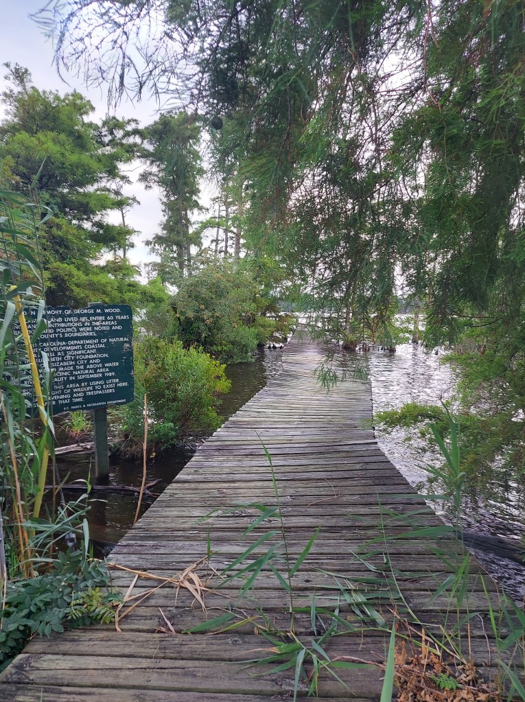 Yellow flies surround me as I walk through thick, humid air and sunlight, to a picnic table to write notes on the way to a gig in Elizabeth City. I’m near the North Carolina-Virginia line. Beside me is the yellow silt-tinged dark Dismal Swamp canal, a 22-mile waterway hand-dug mostly by enslaved laborers over 200 years ago through the Great Dismal Swamp, connecting the Chesapeake bay to the north and the estuaries to the south.