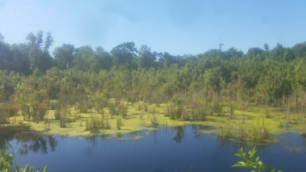 The Canal runs along an east-central section of the current Swamp, connecting to a network of ditches radiating out of the center, the shallow oval Lake Drummond. The Lake is natural, also the highest altitude of the Swamp, so water flows out of it and toward the estuaries on the outside. Outflow is limited though and peat (partially decomposed plant material) from cedar, cypress, and other trees fills the lake, creating tannic acid restricting life for fish and ticks and other insects, and in effect making this part more inhabitable for humans ( this was known to the maroon communities). The ways to access the Lake since the Canal was constructed are by boat, by foot along the Washington Ditch trail (old road), and by car from the west, near Suffolk, along a winding dirt road following the Railroad Ditch (named for the Underground Railroad) and then Interior Ditch. I took the winding dirt road in 2020 and when I reached the Lake, I felt like I had completed a quest. It was nearly complete solitude and peace – just one duck, the lapping waves, and I.