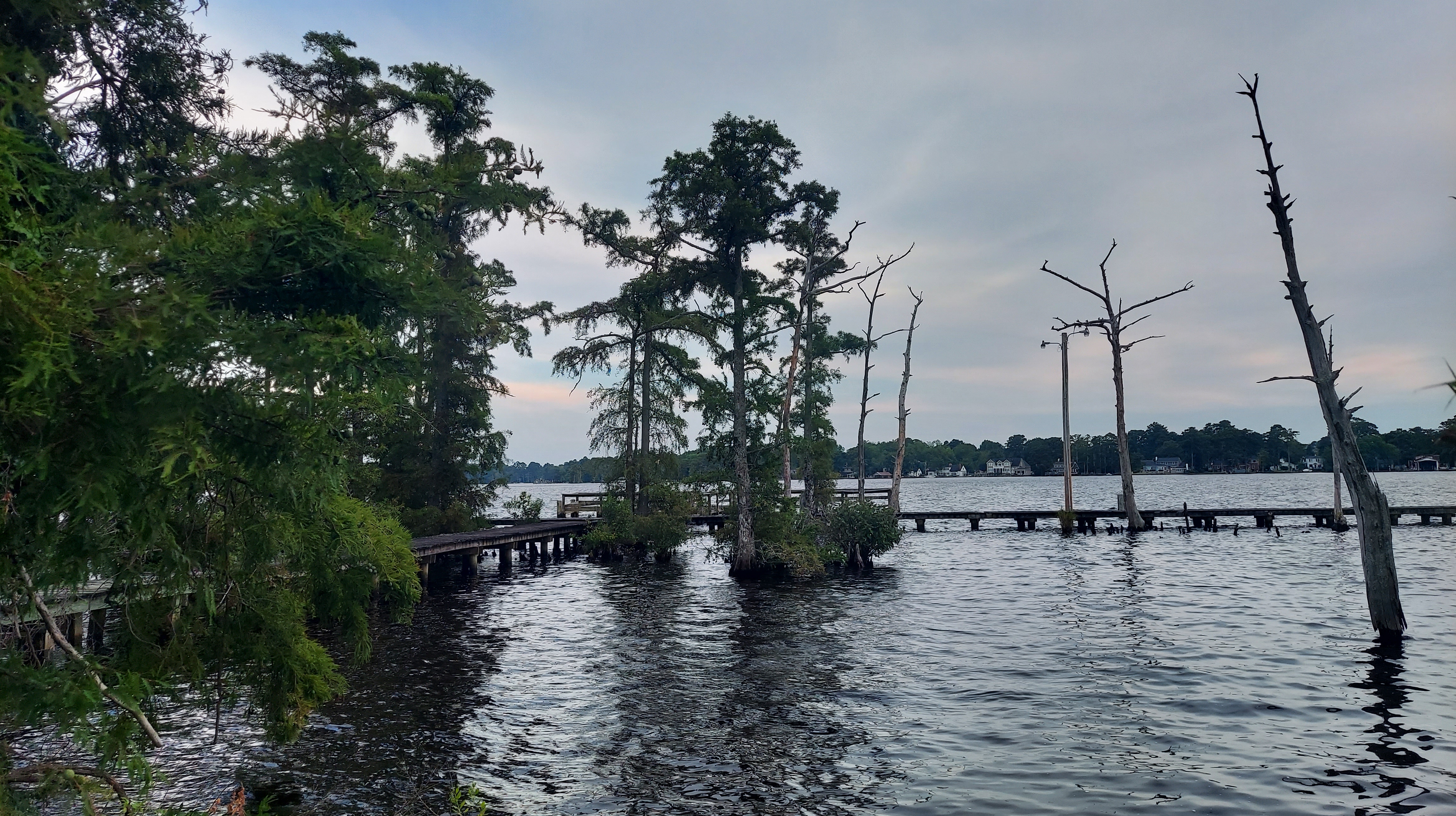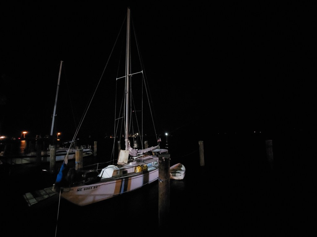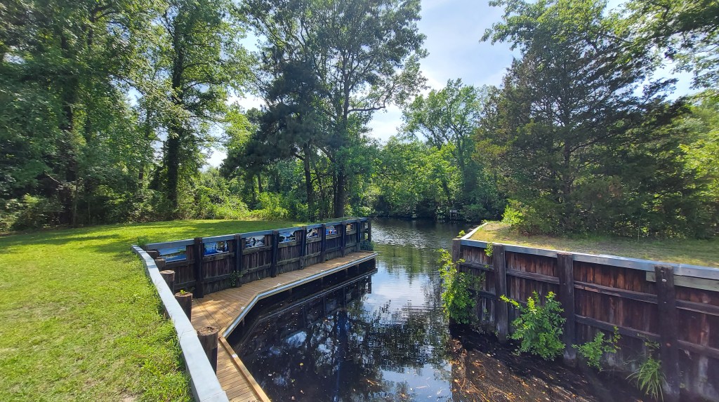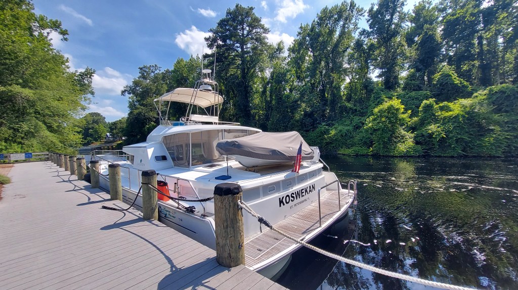 At the south end of the historical Swamp lies Elizabeth City, North Carolina and its quaint, historic waterfront on the Pasqotank River known as the “Harbor of Hospitality.” Signs at the Mariner’s Wharf mention 48 hour complimentary docking and the “Rose Buddies” who would clip local roses and offer them to first mates and other visitors by boat. There is a slight breeze from the river and the whole downtown feels ready to relax. A few tourists are out on foot, but only two boats are docked. Tonight, a movie screens on the green next to the wharf: Maleficent.