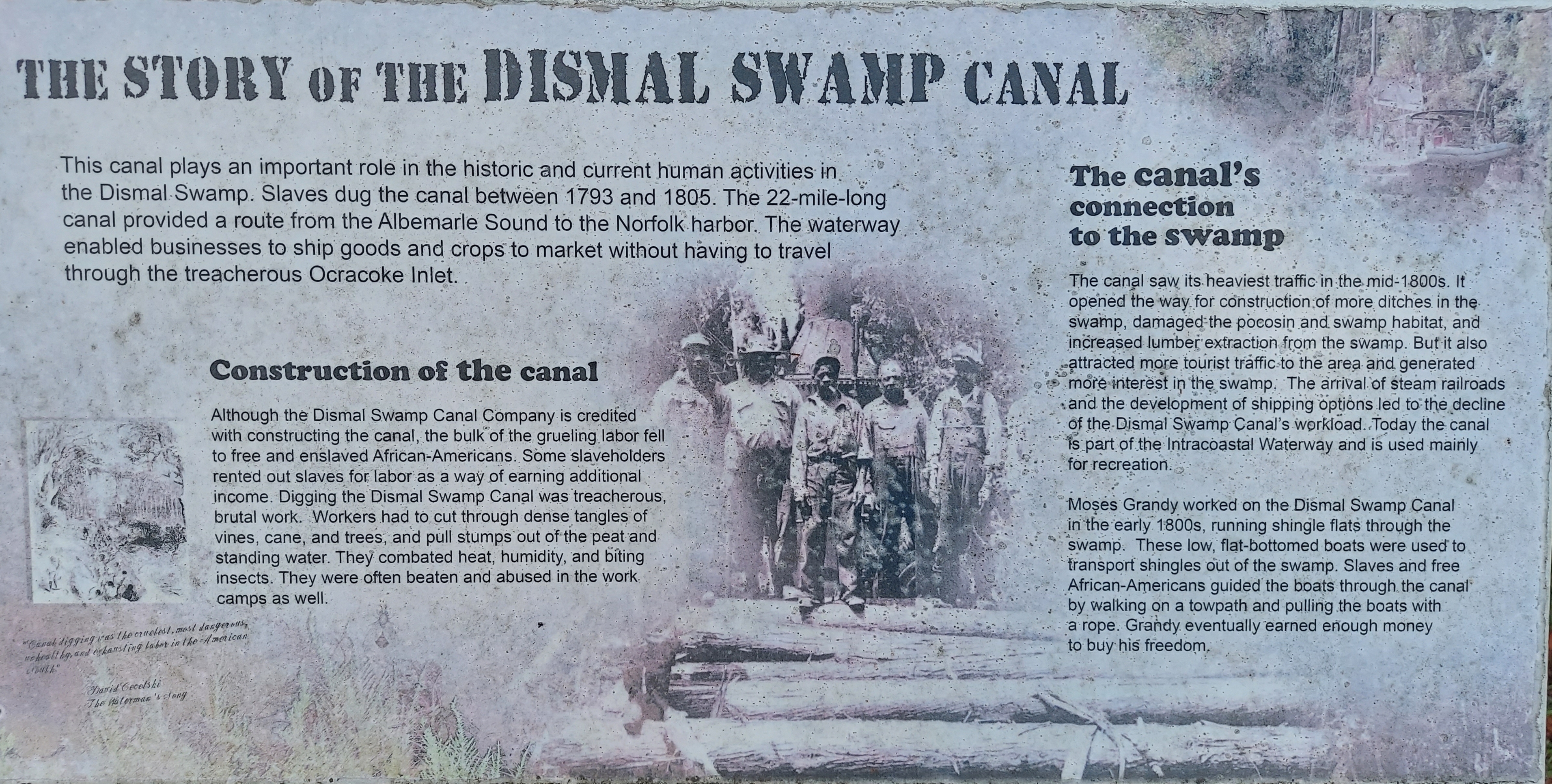 Moses Grandy worked digging the canal as a youth. His skills led him to get better work running cargo ships transporting merchandise to Norfolk from the southern parts of the North Carolina, where he grew up. The Canal was new and busy and an important route for commerce at this time. In 1813, Moses, still enslaved at age 21, was offered work as a freight boat Captain and eventually made enough money to purchase his freedom. His autobiography, published in 1843, is definitive literature from the era and of local Black history and his descendent in Hampton Roads is working to preserve this legacy. Watch this video for more.