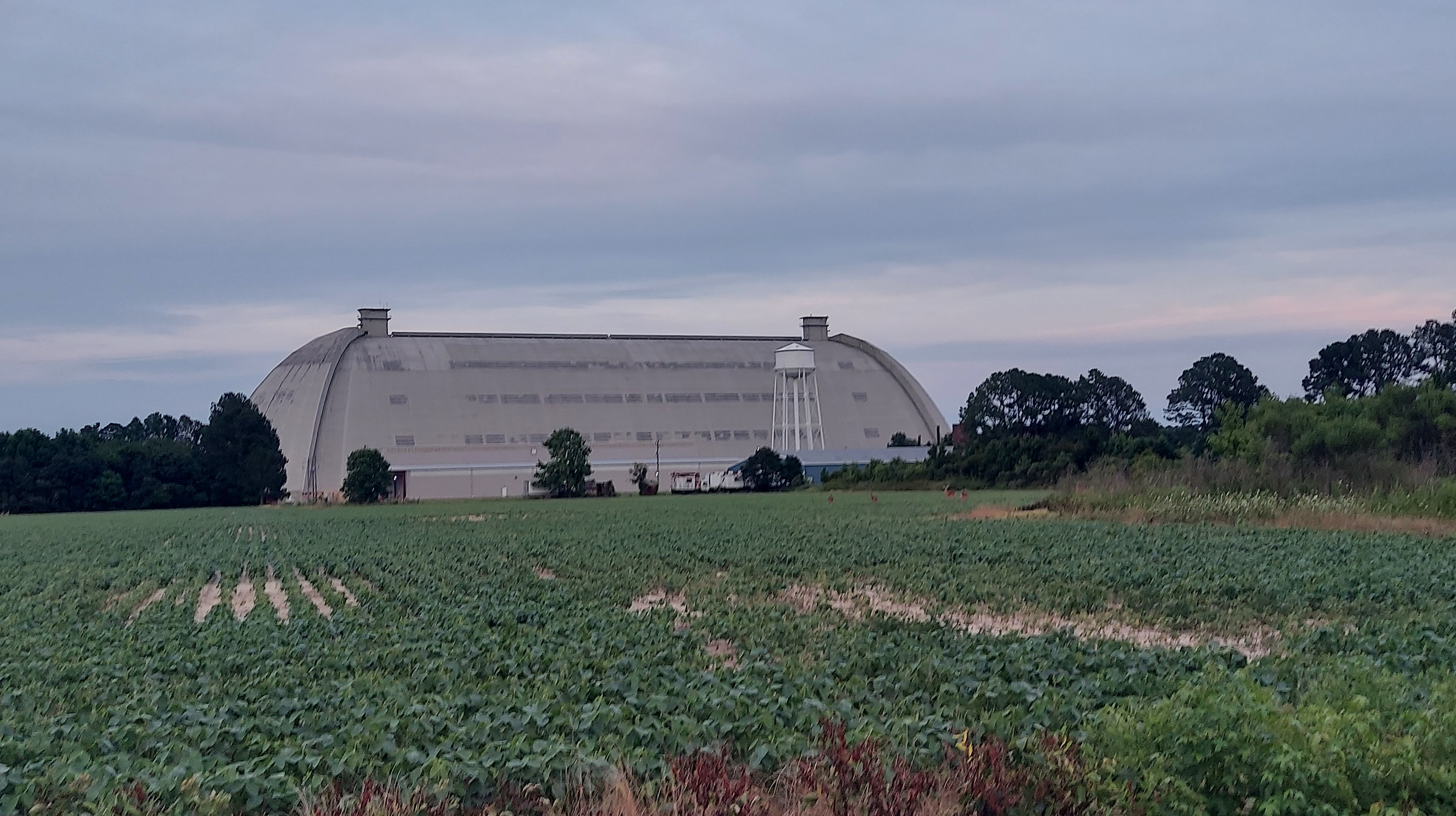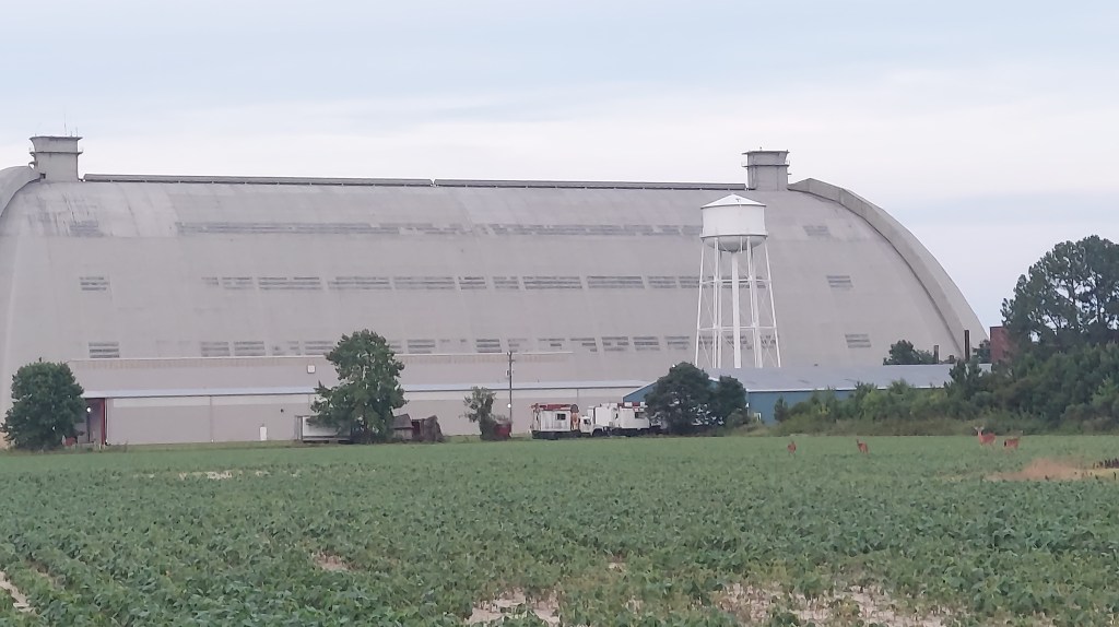There is one site southeast of Elizabeth City I feel is important to visit. The Weeksville Airship Hangar, built in 1941 to house blimps for World War 2 but out of use since 1957 still stands, on private property, beyond the Coast Guard station. Deer frolic on the surrounding farmland as I dash for a sundown picture.