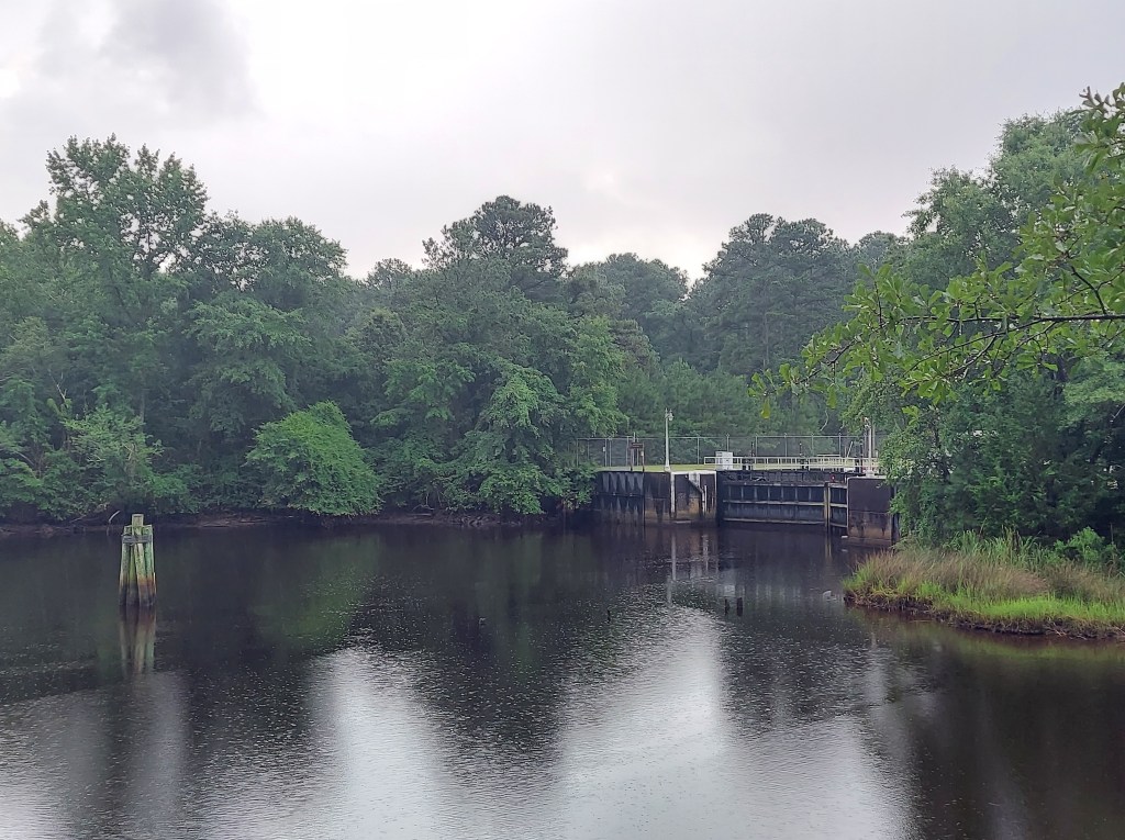 At its north end, the Canal connects with Deep Creek which flows through a lock into Norfolk and Hampton Roads, by the historic community of Deep Creek. On this July afternoon, I stand alone at the lock and park surrounded by suburbs and passing traffic.