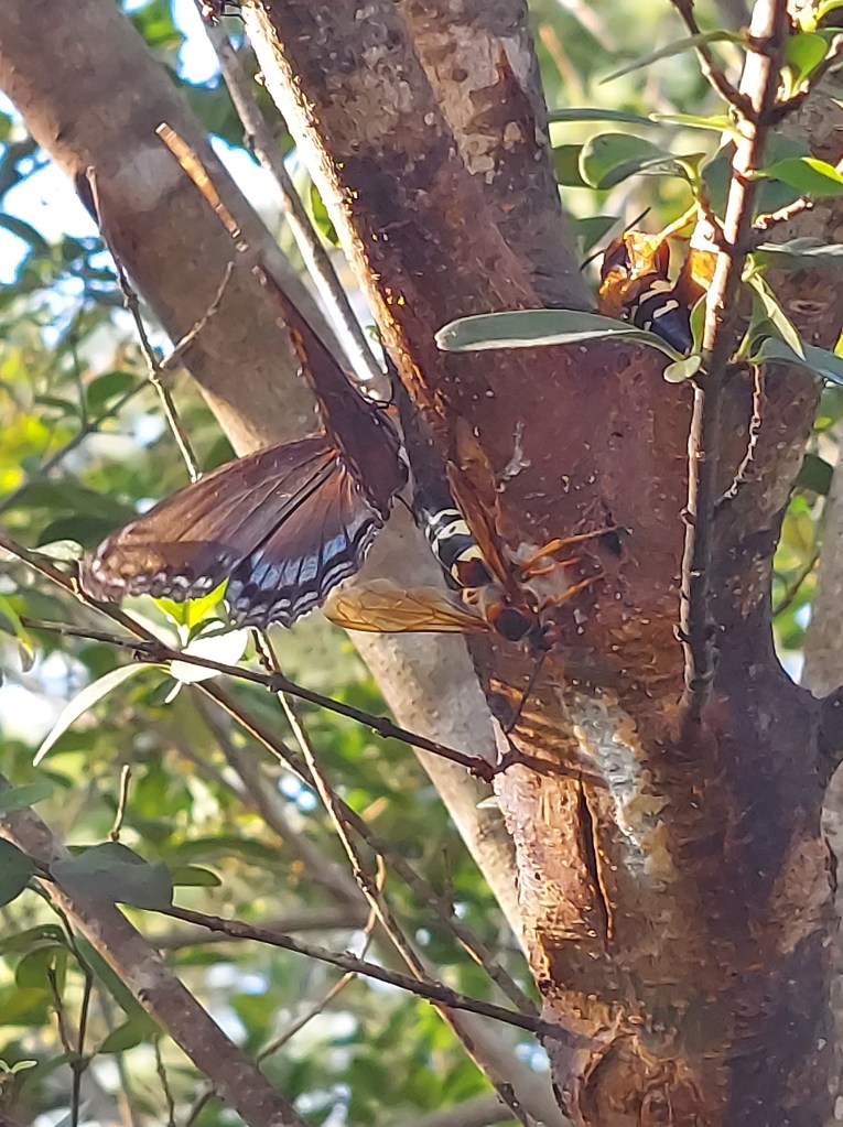 The metal dinosaurs of Jerrassic Park stand warmly a few miles south on Princess Anne Rd, so I take my parents to see them while they’re in Pungo. My mom especially enjoys these sculptures, and my mood is more playful this time. The sunlight bears down upon us, making the dinosaurs hot to touch, while mushrooms hide in the shade of a nearby bush. We are the only humans here for most of our visit, but I get to witness a butterfly hanging out with some wasps.