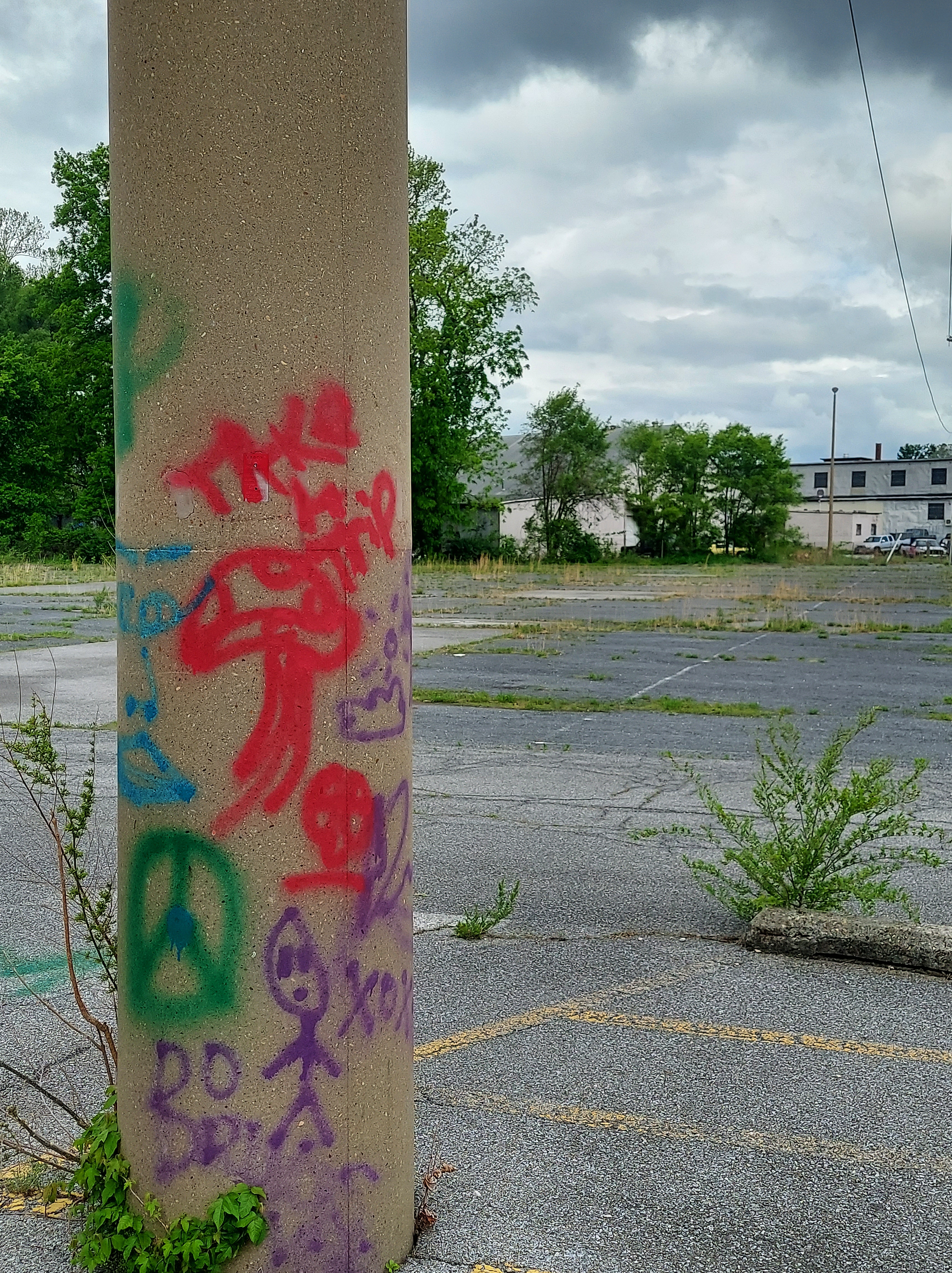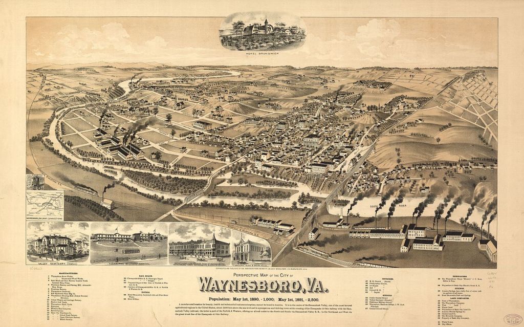Further north, the greenway continues by the river as it flows downstream. The babbling water is all I hear. Across the river are the remnants of Basic City, which developed as a steel-industry boom town in 1890 where the Chesapeake and Ohio Railroad crossed the Norfolk and Western. In the map near the top of this post, one of the large smoky factories represents this area. This is probably the Basic City Mining and Manufacturing Company, who set up the town. The boom didn’t last, and by 1924, it became part of Waynesboro. This is still considered to be an economically distressed area, with vacant shopfronts and some empty lots. Currently operating here are a large laboratory “testing equipment for the US Government” and another company named “Radium, Inc.” Another large historic employer in this area of town is Virginia Metalcrafters, which operated from 1925-1996, producing hardware materials for Colonial Williamsburg. In its new incarnation, it offers a space for independent crafters and the complex also houses Basic City beer company (which has a Nils Westergard mural on its wall). I didn’t have time to stop here but it’s another interesting old factory and you can find out more on their website.