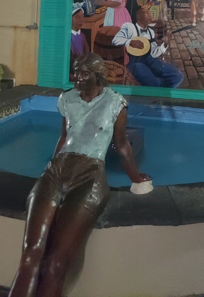 While eating beignets at Café du Monde in le Vieux Carré, the French Quarter (the café is open till 11), I slip back to a fountain behind the restaurant and find this “Michelle” sculpture and mural. The mural, “Window into the Past” by Cayenne Shakor, depicts an 1800s scene at the New Orleans French Market and includes 5 historic figures such as Edgar Degas, Rose Nicaud, and Marie Laveau. It was originally painted in 2006 (after Katrina), then was damaged during Hurricane Ida in 2021, and has since been restored. As it turns out, I’ll meet the artist tomorrow at his outdoor shop next to the café.