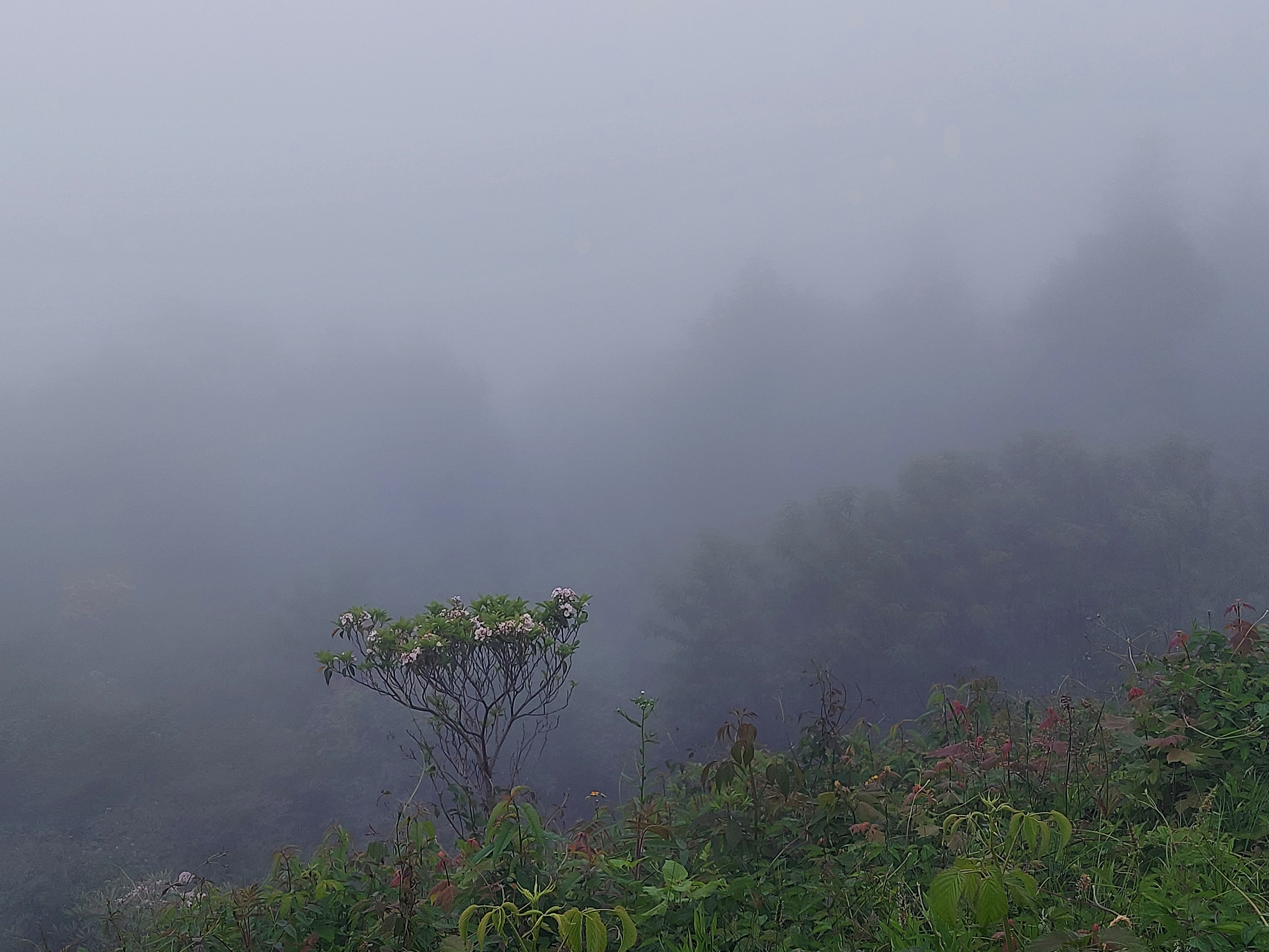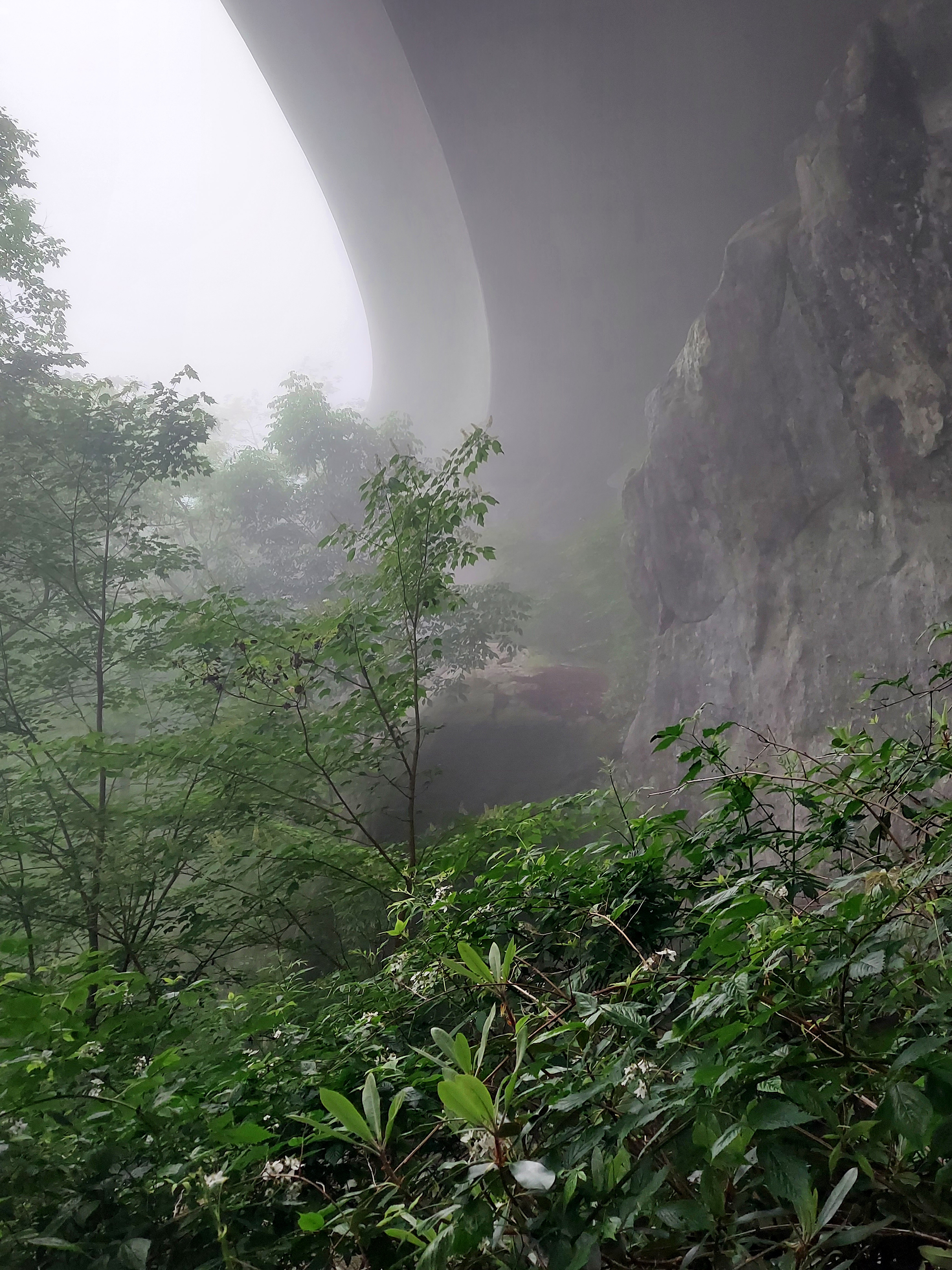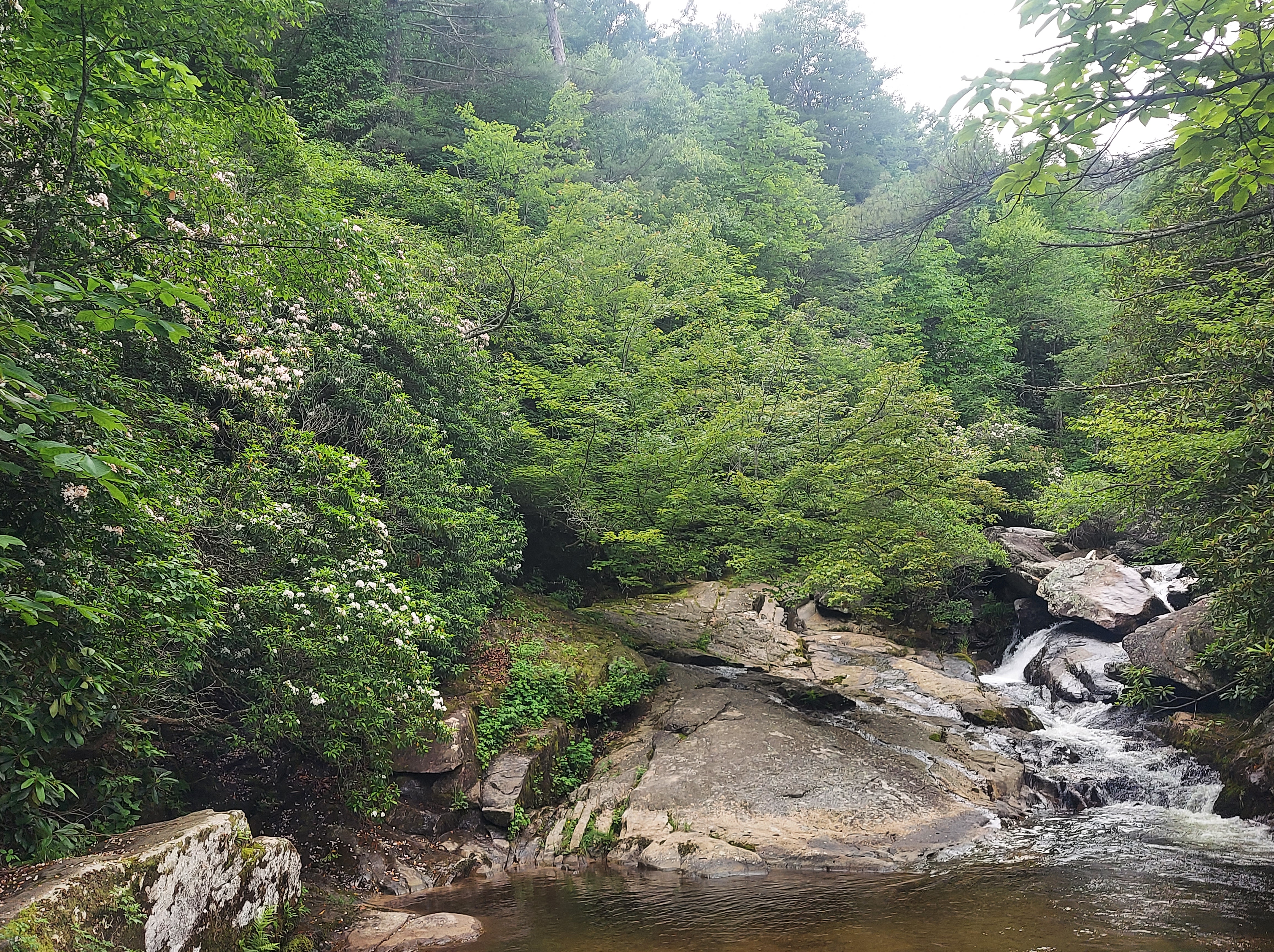 Around Grandfather Mountain, NC (~5000 ft elev), a day later, I become immersed in a foggy wonderland with flame azalea, mountain laurel, and more colorful flowers; I hike to Upper Creek Falls, and then into Linn Cove under the Parkway Viaduct (!) which are epic and amazing, but without Catawba Rhododendron. (I had seen photos with blooms posted from this area). Only on the way south, near Jonas Ridge, do I pass a single bush with its unmissable bell-shaped bunches of pink-purple flowers, as I end today’s search.