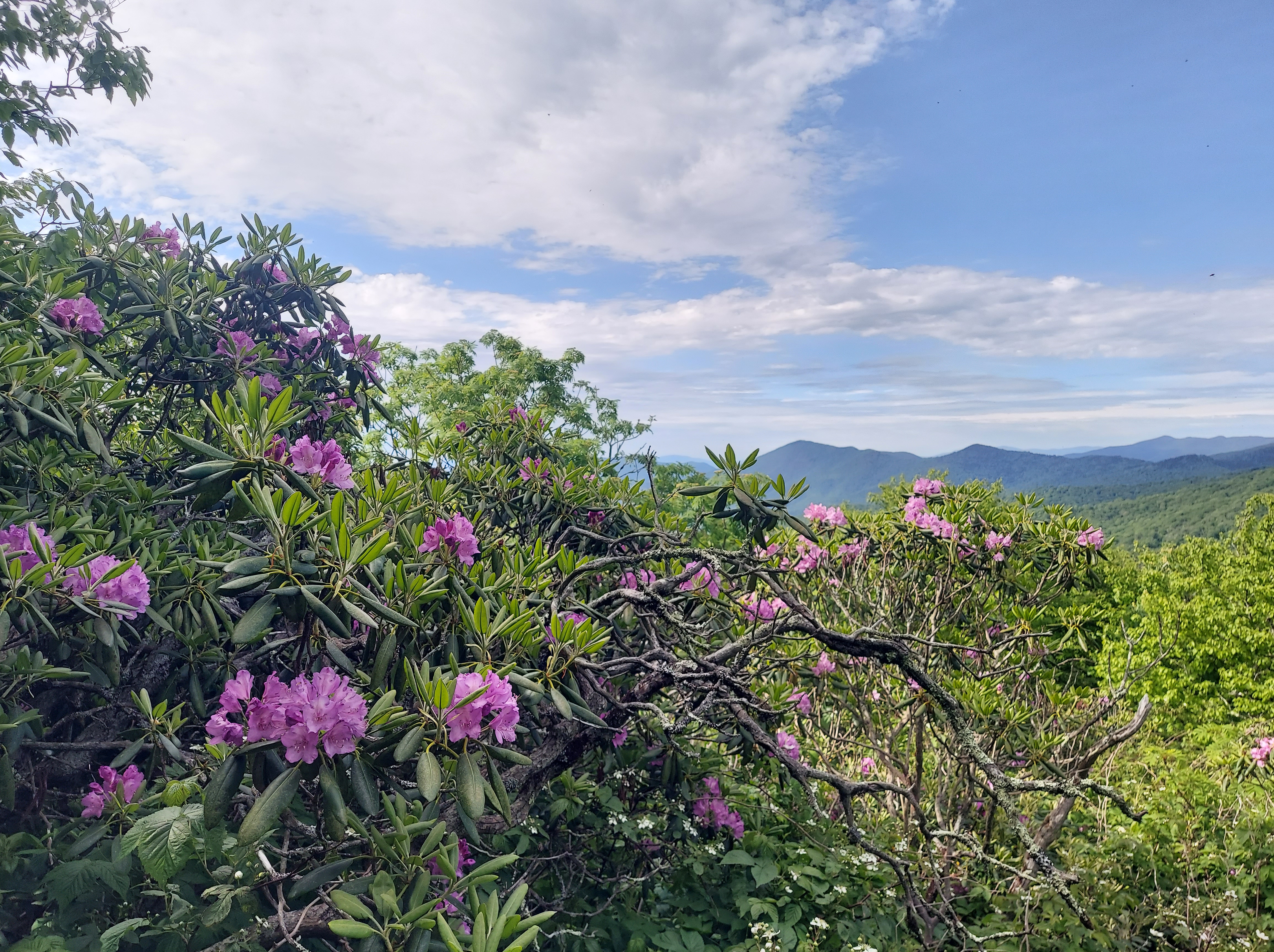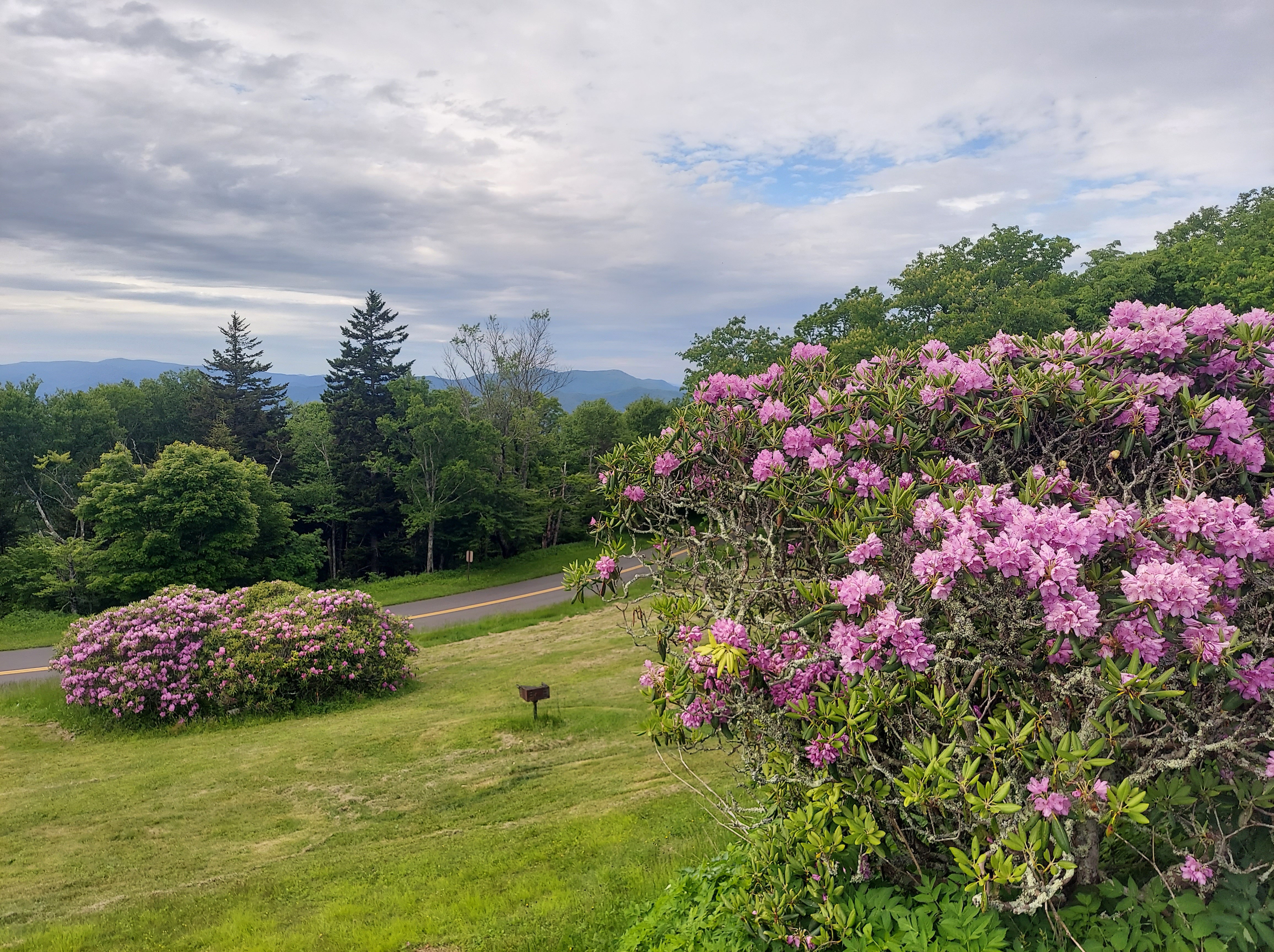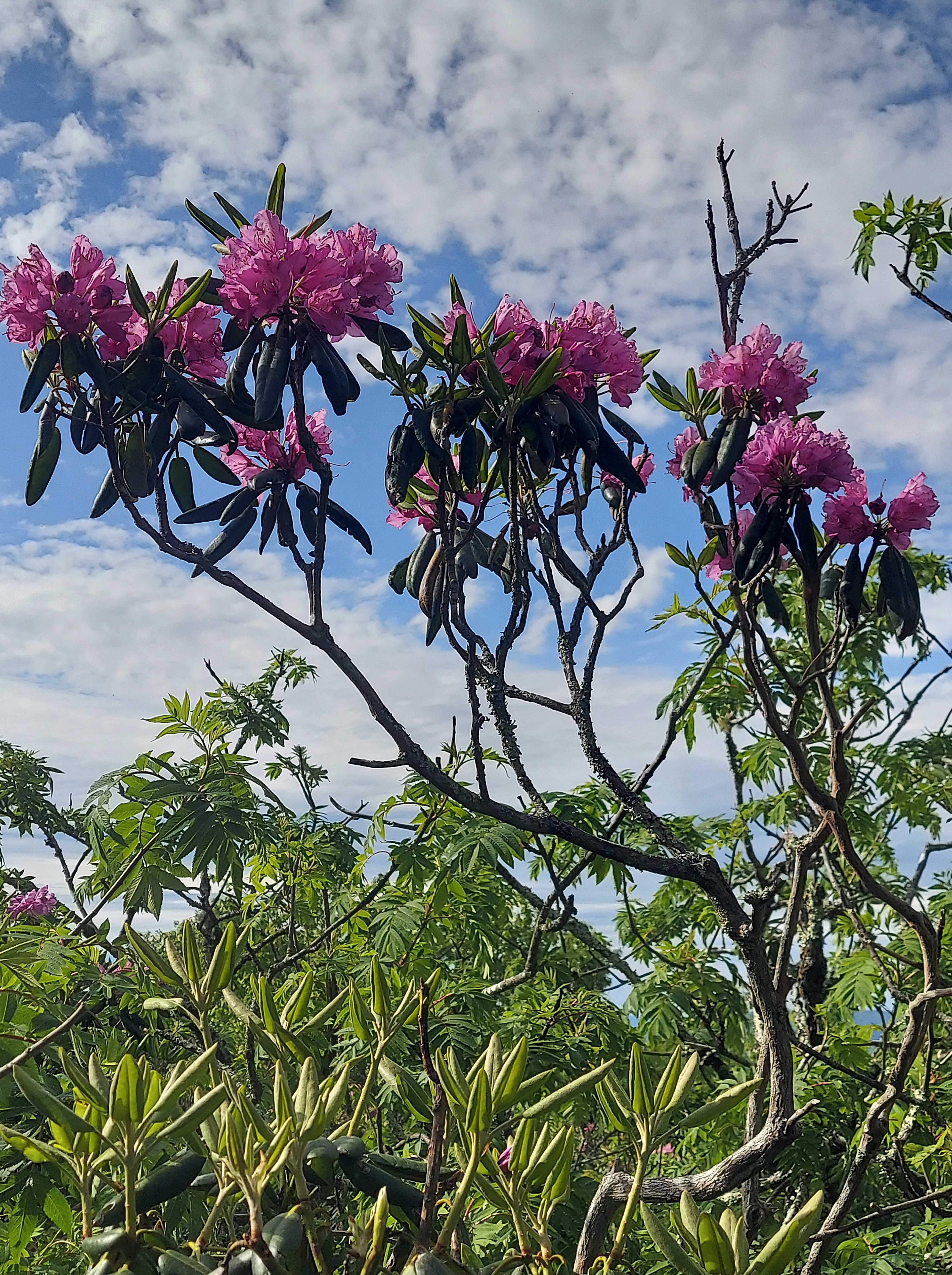 June, 2024. The spring bloom period in the eastern woodlands finally reaches the Appalachian mountains. Gardens in the cloud forest create a spectrum of color, coinciding with LGBTQ+ Pride month. Along the Blue Ridge Parkway, Flame Azalea shines bright orange, and mountain Laurel shows a range of pinks. Catawba Rhododendron blooms, at elevations 3000 ft and above, this intense magenta-purple-pink-fuschia that complement the dark green leaves against the blue sky/gray fog, which I love so much. (I wish I could pollinate you all like the bees do!)