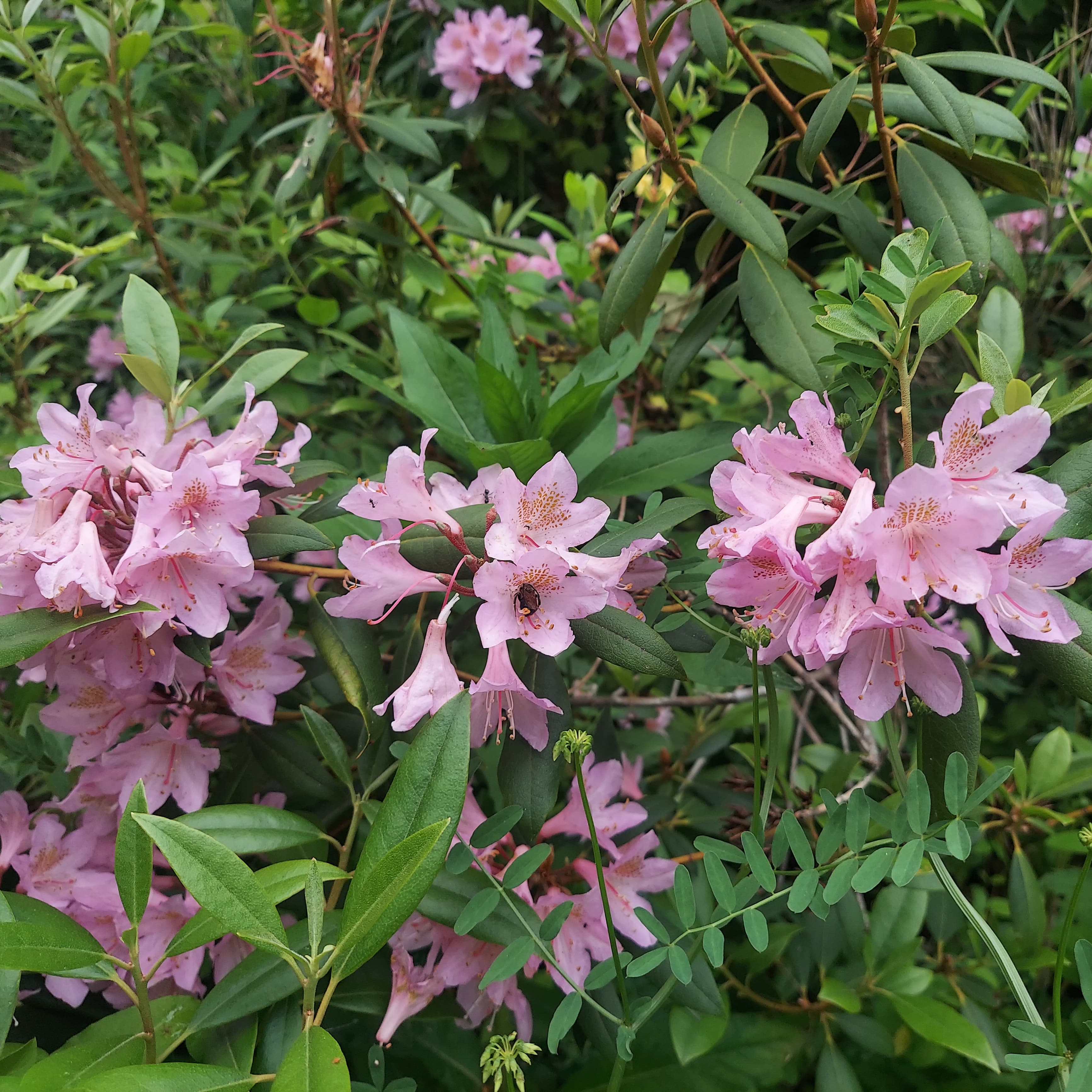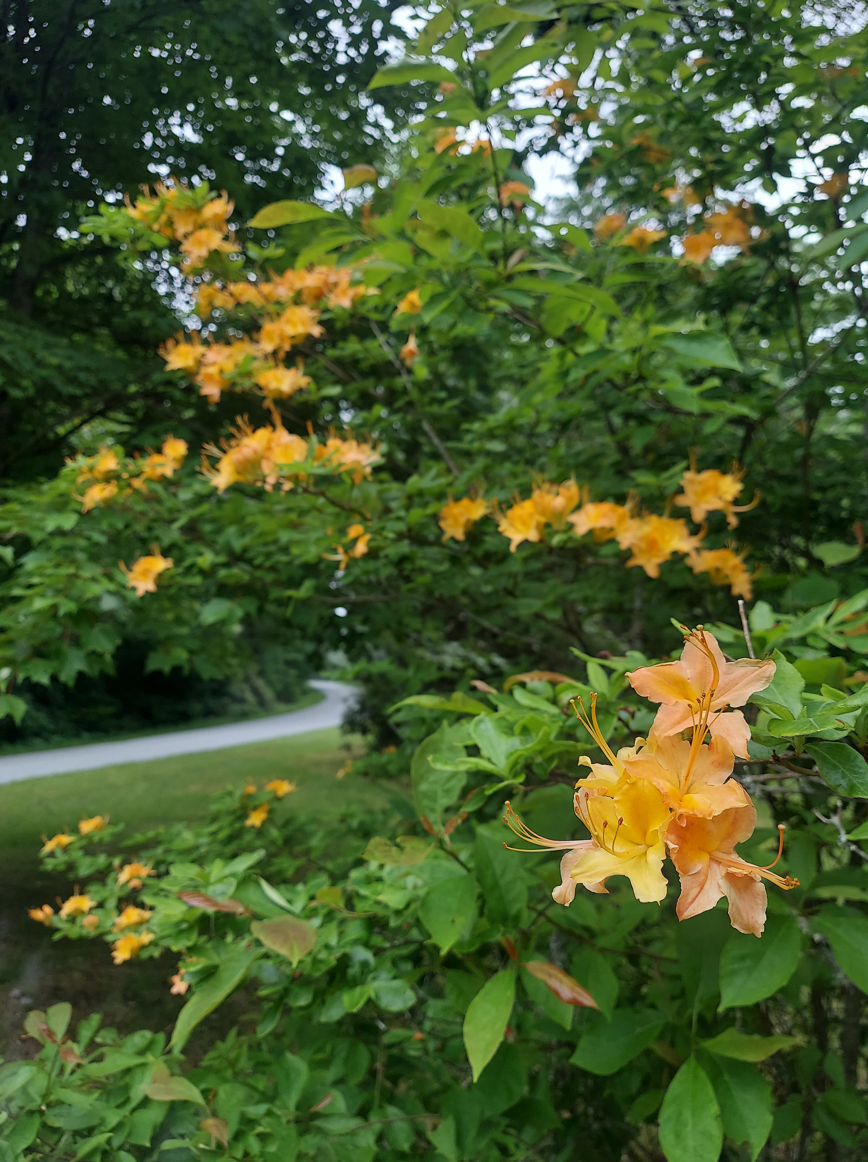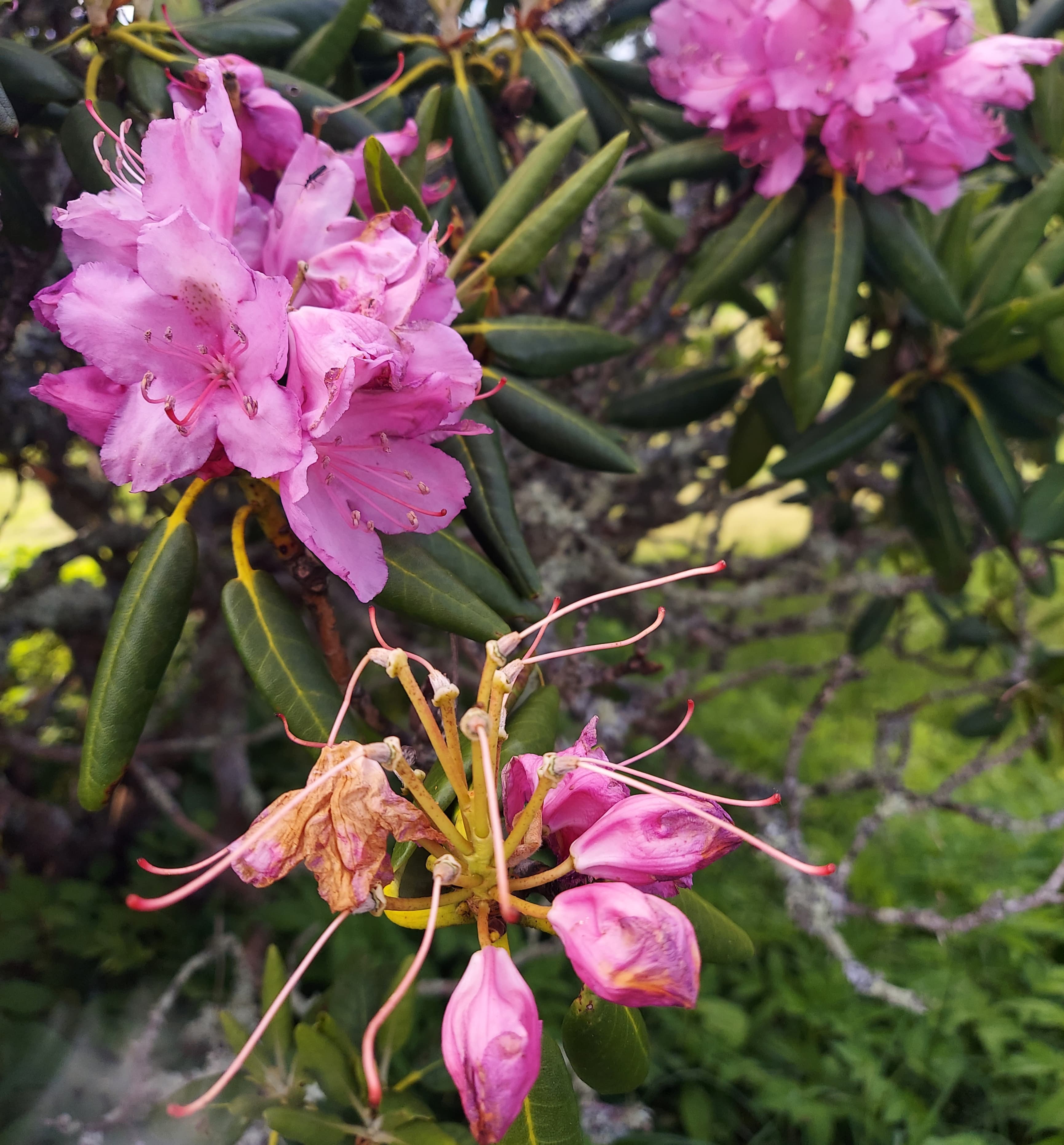 June, 2024. The spring bloom period in the eastern woodlands finally reaches the Appalachian mountains. Gardens in the cloud forest create a spectrum of color, coinciding with LGBTQ+ Pride month. Along the Blue Ridge Parkway, Flame Azalea shines bright orange, and mountain Laurel shows a range of pinks. Catawba Rhododendron blooms, at elevations 3000 ft and above, this intense magenta-purple-pink-fuschia that complement the dark green leaves against the blue sky/gray fog, which I love so much. (I wish I could pollinate you all like the bees do!)