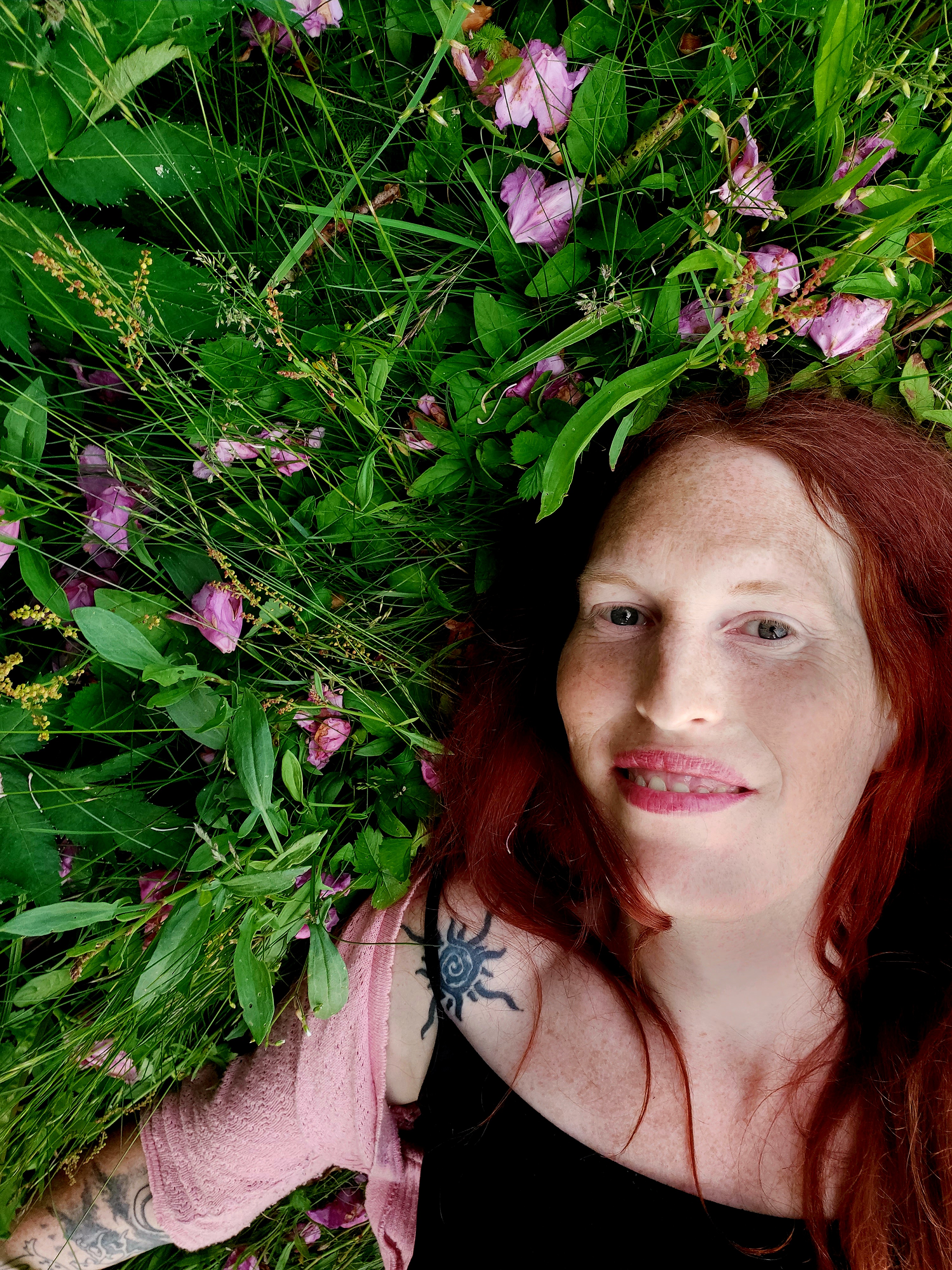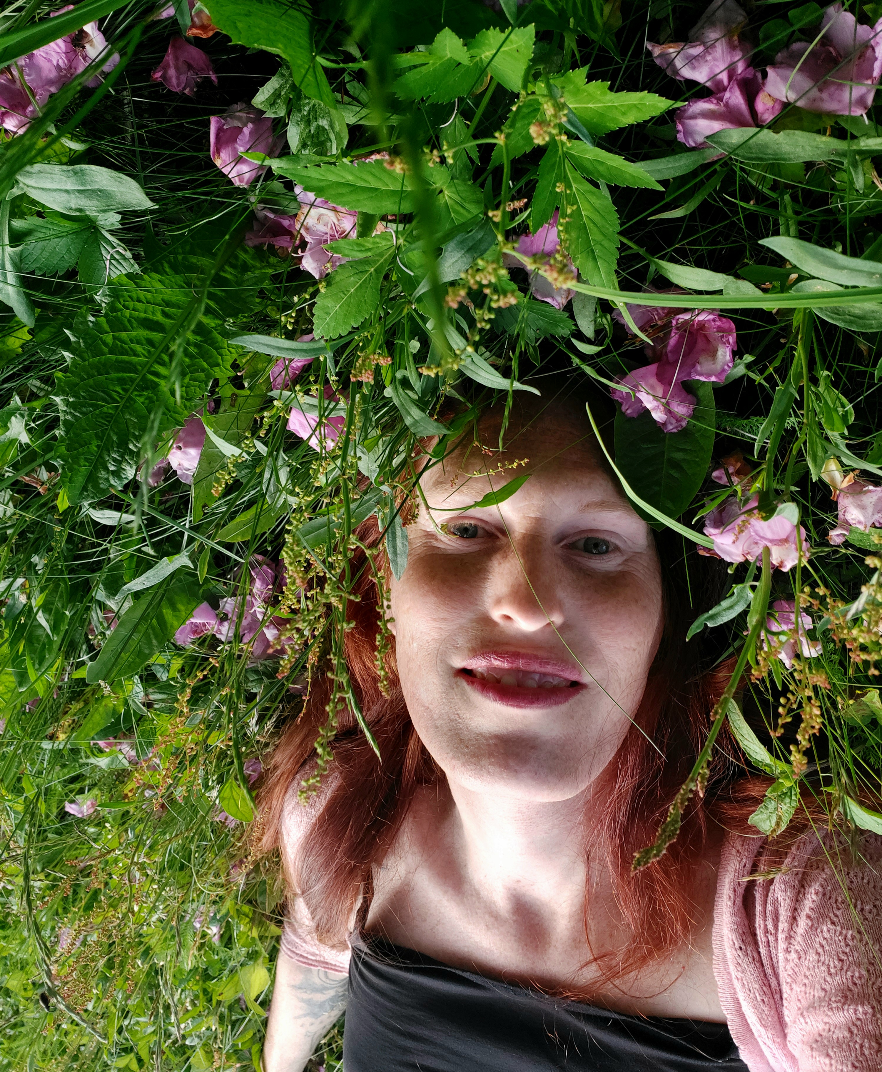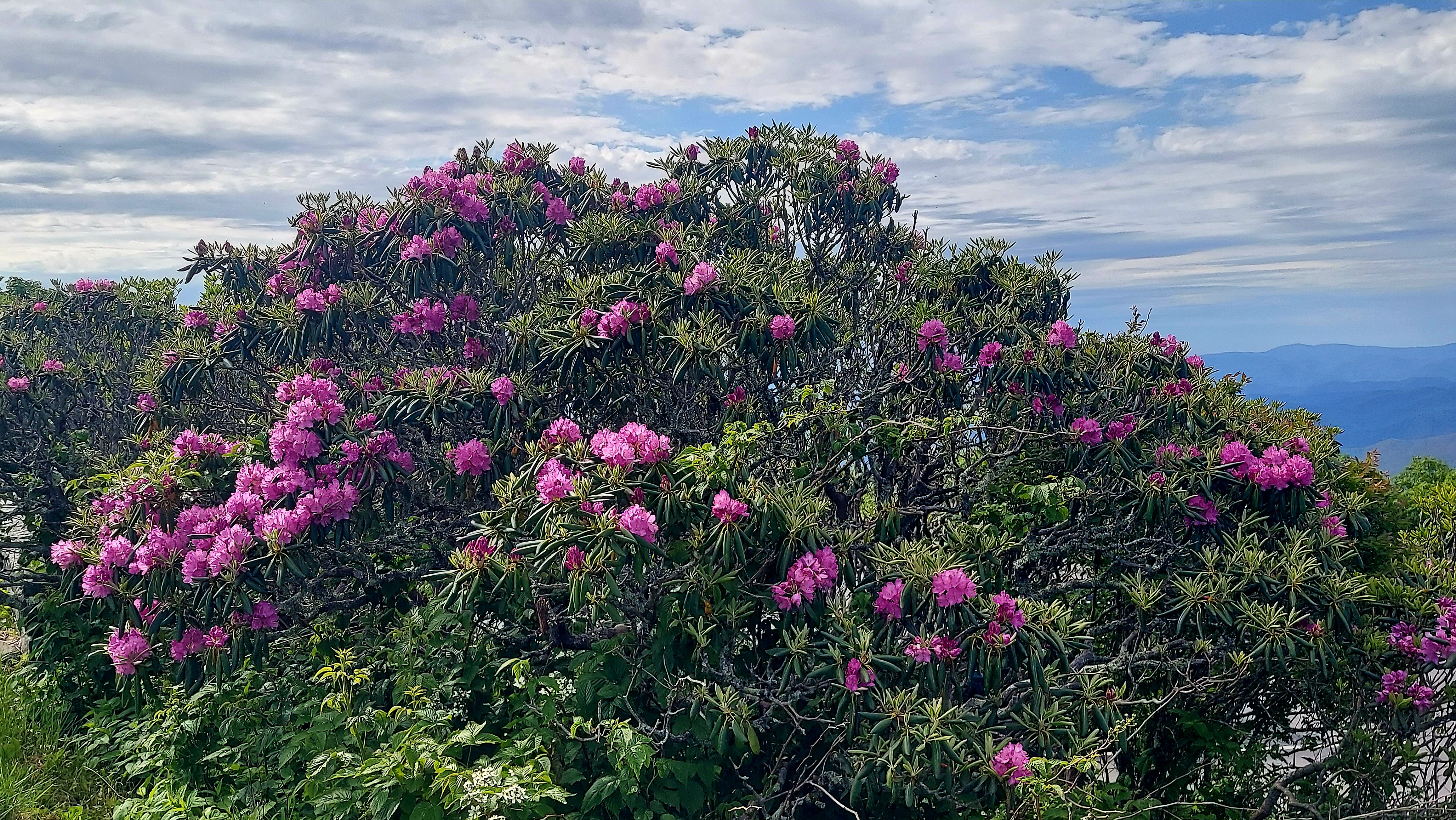 Finally, as I near Craggy Gardens, the flowers appear more frequently along the Parkway, and at Craggy Pinnacle overlook, they are everywhere. Craggy Gardens (along with Roan Mountain) is famous for its Rhododendron blooms, and now I understand why. Thickets full of flowers cover this heath bald, in all stages of bloom from pink-purple buds to yellow-tipped fallen petals, on small bushes and on wise old trees with wind-bent branches. It’s wonderful. There are plenty of folks around, but it’s not crowded today. The weather is pleasant; bright and breezy. Between the Pinnacle overlook and the picnic area, I spend at least two hours here, frolicking, posing, and eating peanut butter & berries with the bees. I’m even dressed like the rhododendron. It’s RHODA, the event, and I am in ecstasy, wearing a flower crown.