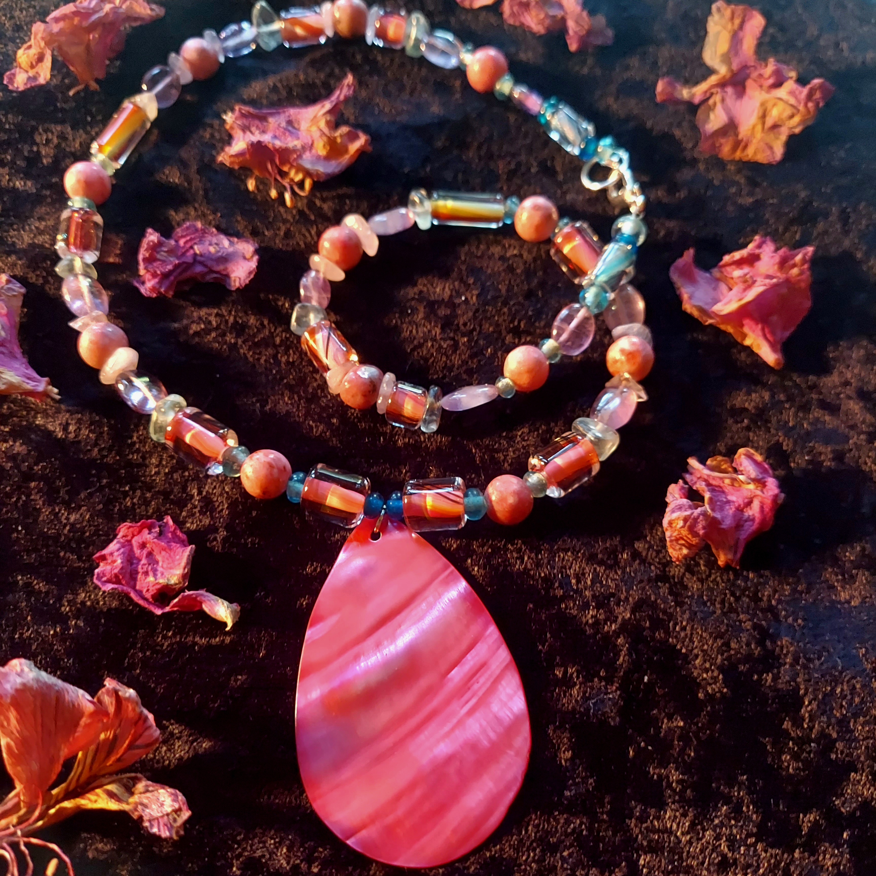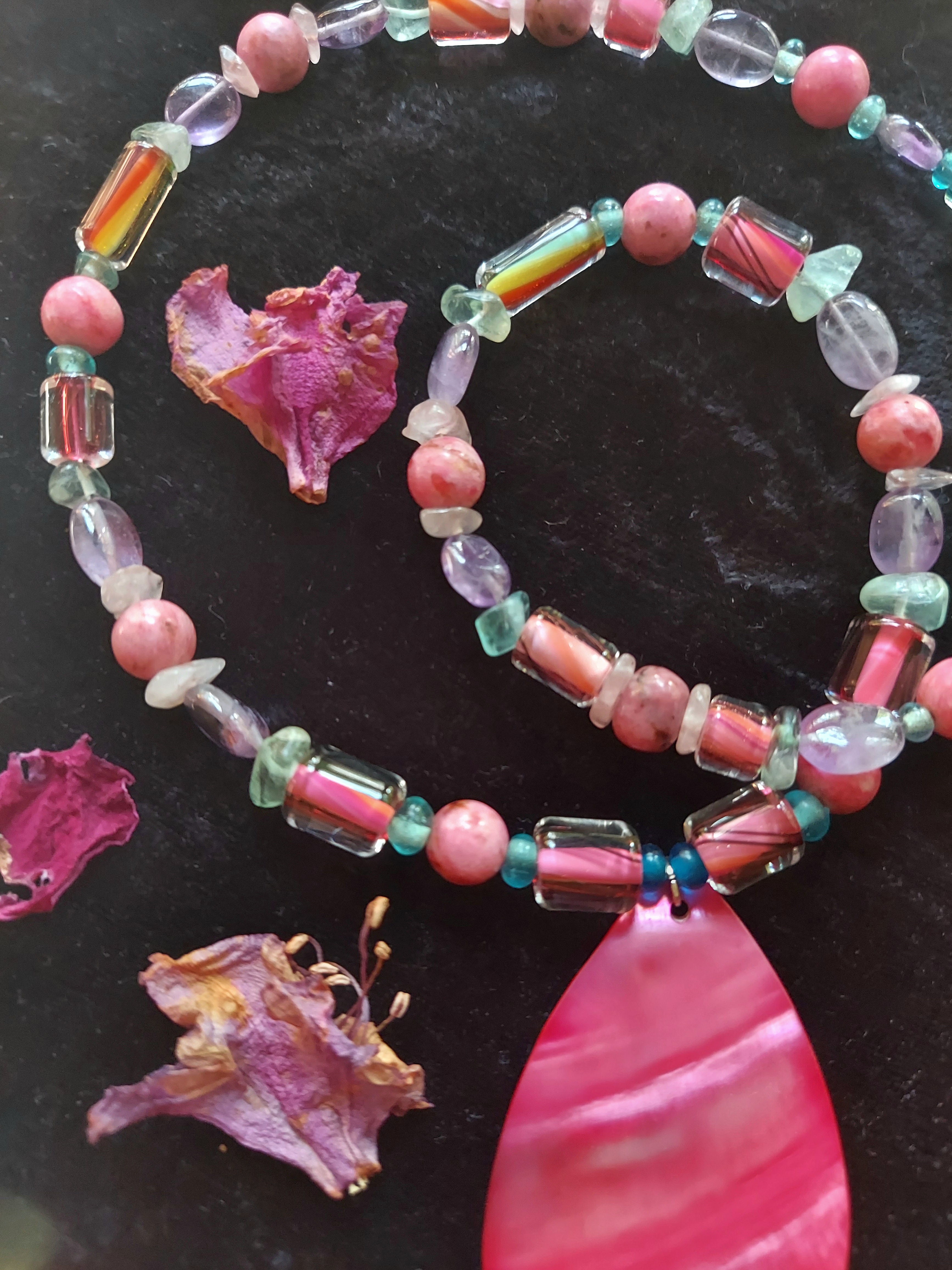 In the Piedmont, spring is turning into summer, and Pride festivals are happening. Chappell Roan plays a show in Raleigh, and the club where I’ll set up for a market hosts an afterparty. To songs like “Pink Pony Club” and “Red Wine Supernova,” I make this rhododendron flower motif necklace, with abalone shell pendant, amethyst, rose quartz green fluorite (foliage), jasper, rainbows, pinks and blue glass beads. I decide that if rhododendron flowers were a person, they would be Chappell Roan (mountain).