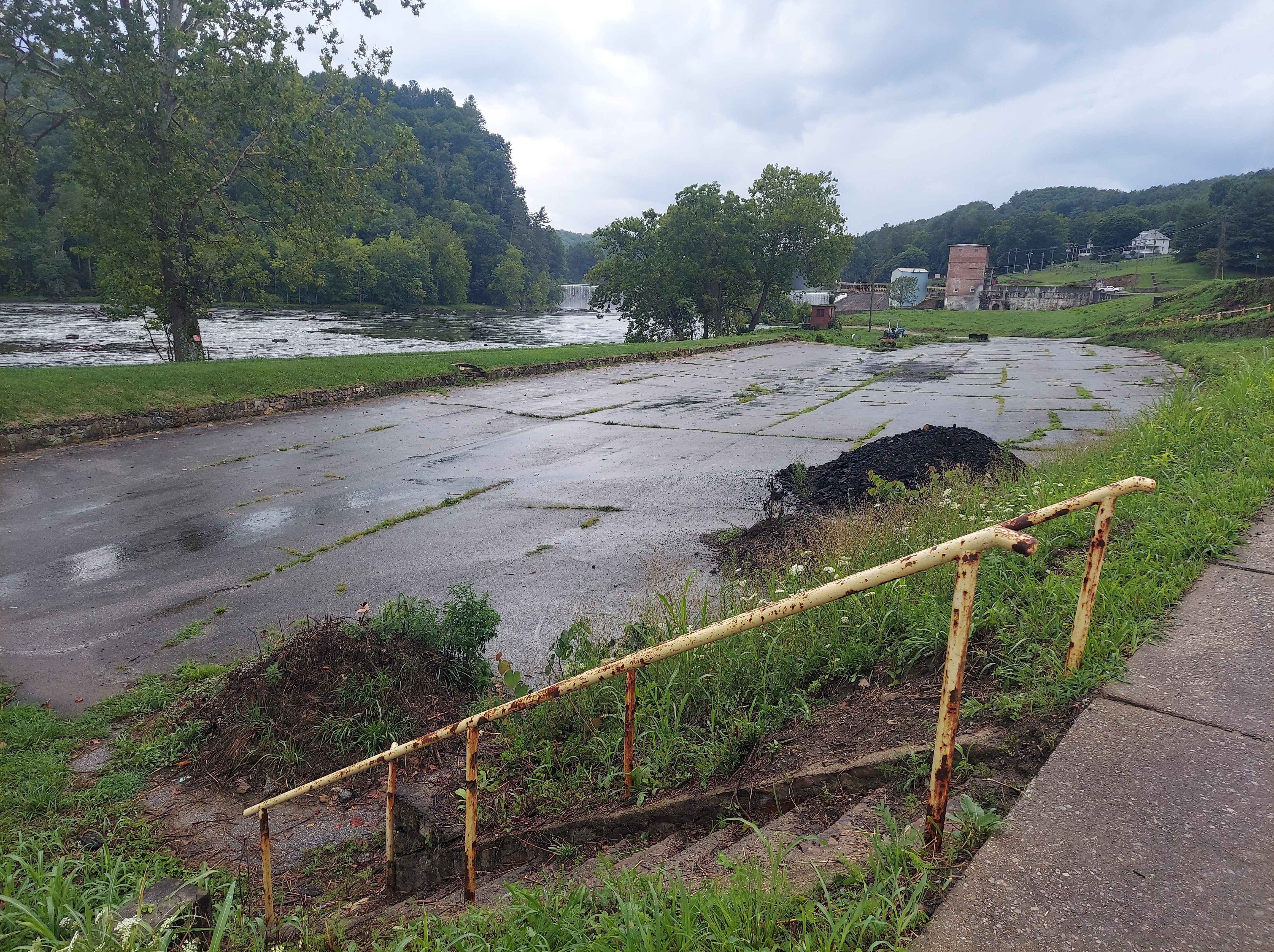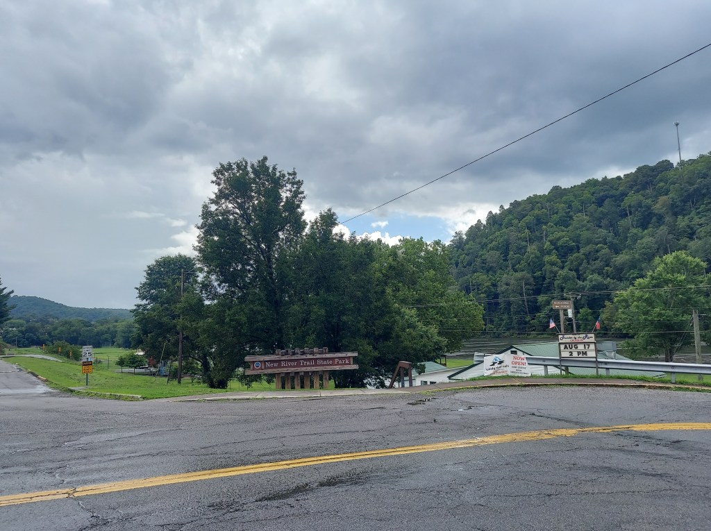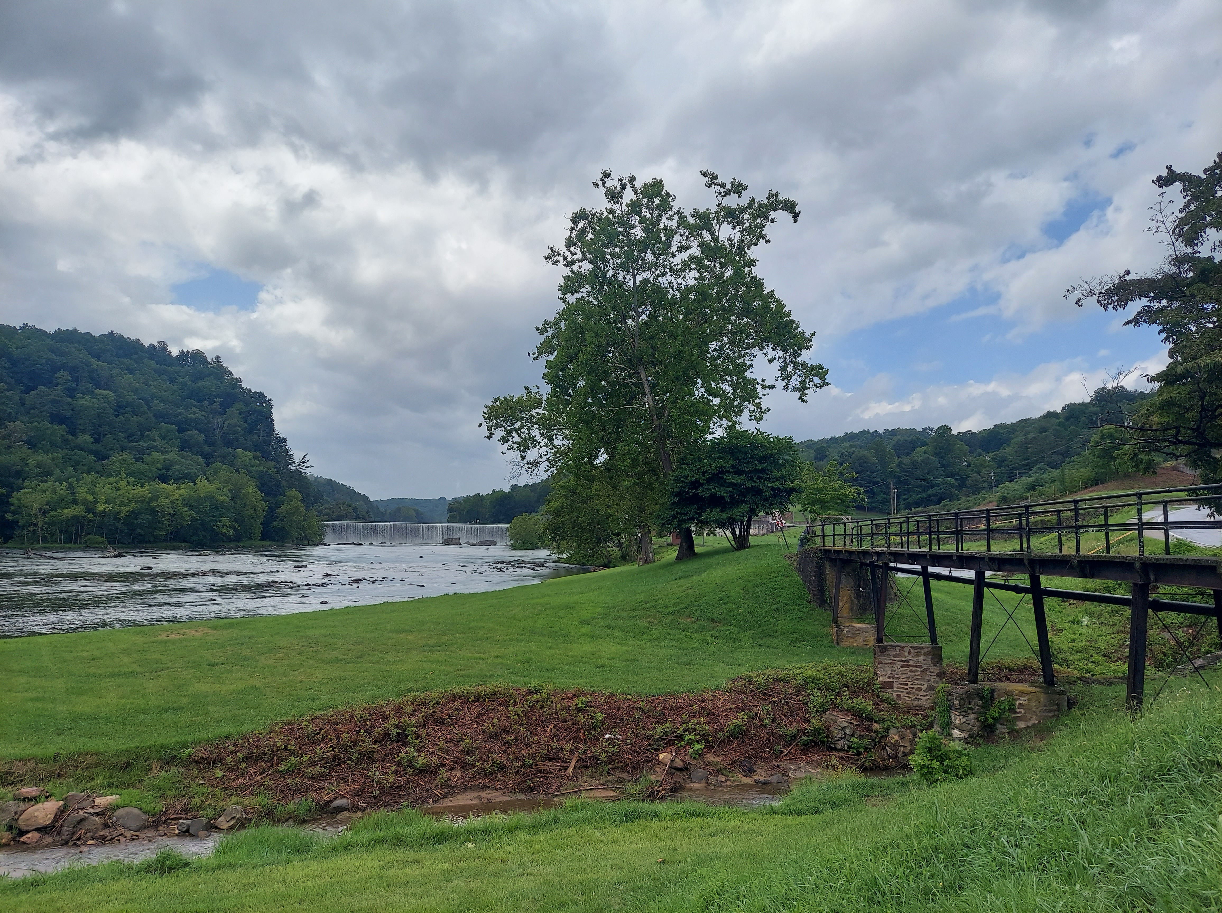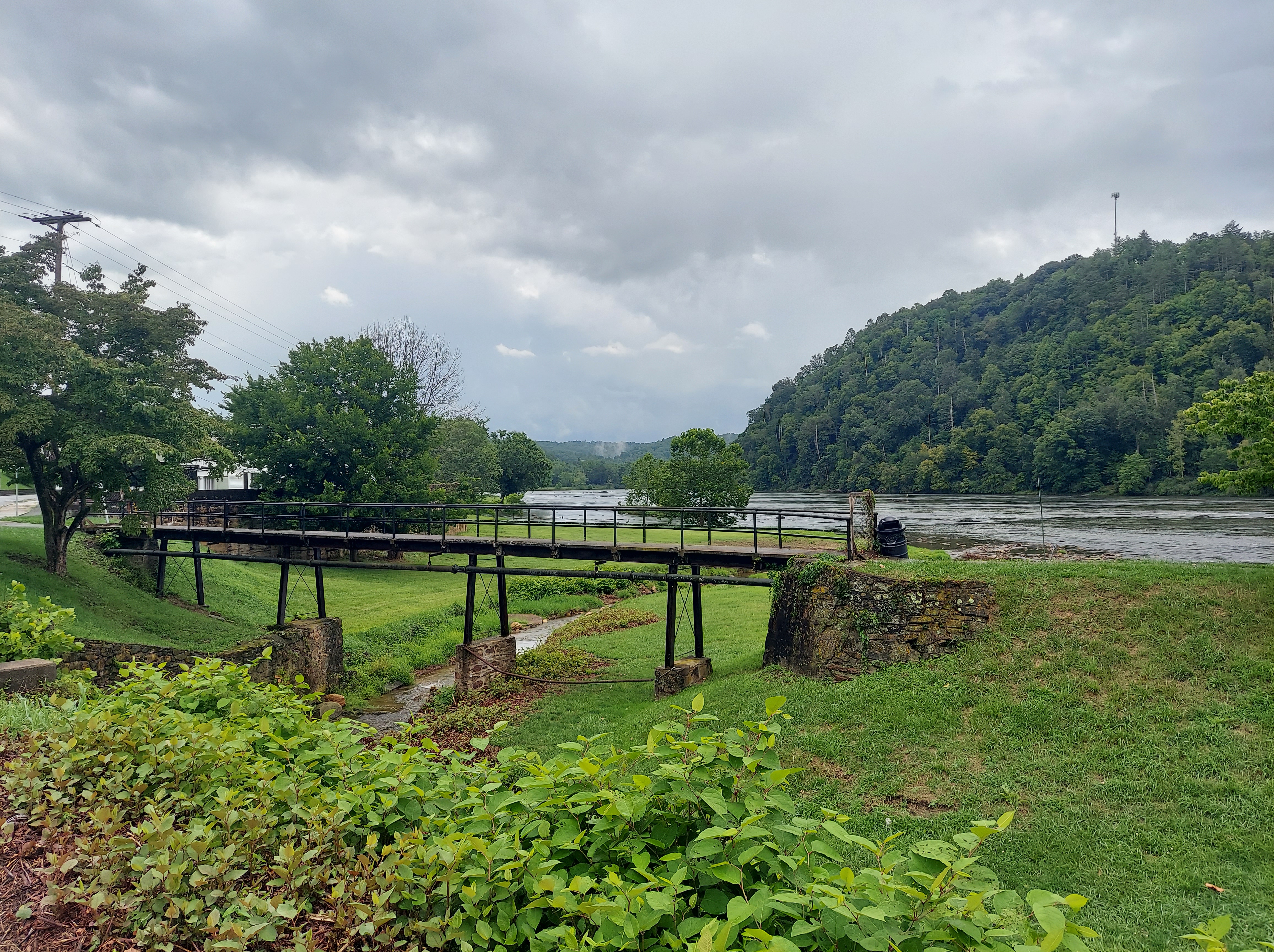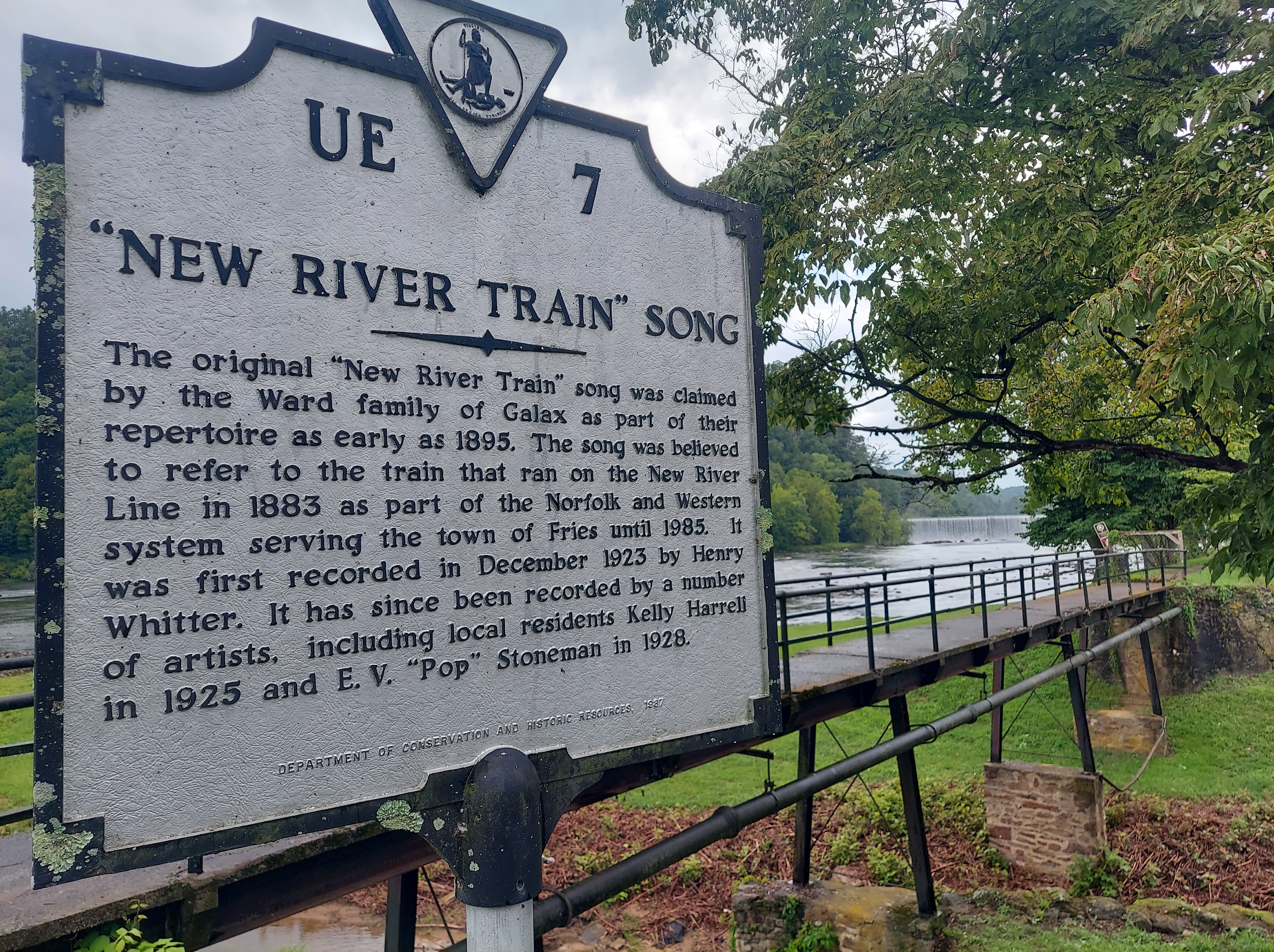 The river is the ancient New (Kanawha) River, and this town is set along two of its bends at a natural falls on the river. It started with a cotton mill and hydroelectric dam at the dawn of the 1900s, soon connected by the New River train. The town developed around the Washington’s Mill and its employees; population peaked in the 1920s and 1930s at just above 2,000. In 1989, the mill closed, and the New River Trail now occupies the old New River Train line.
