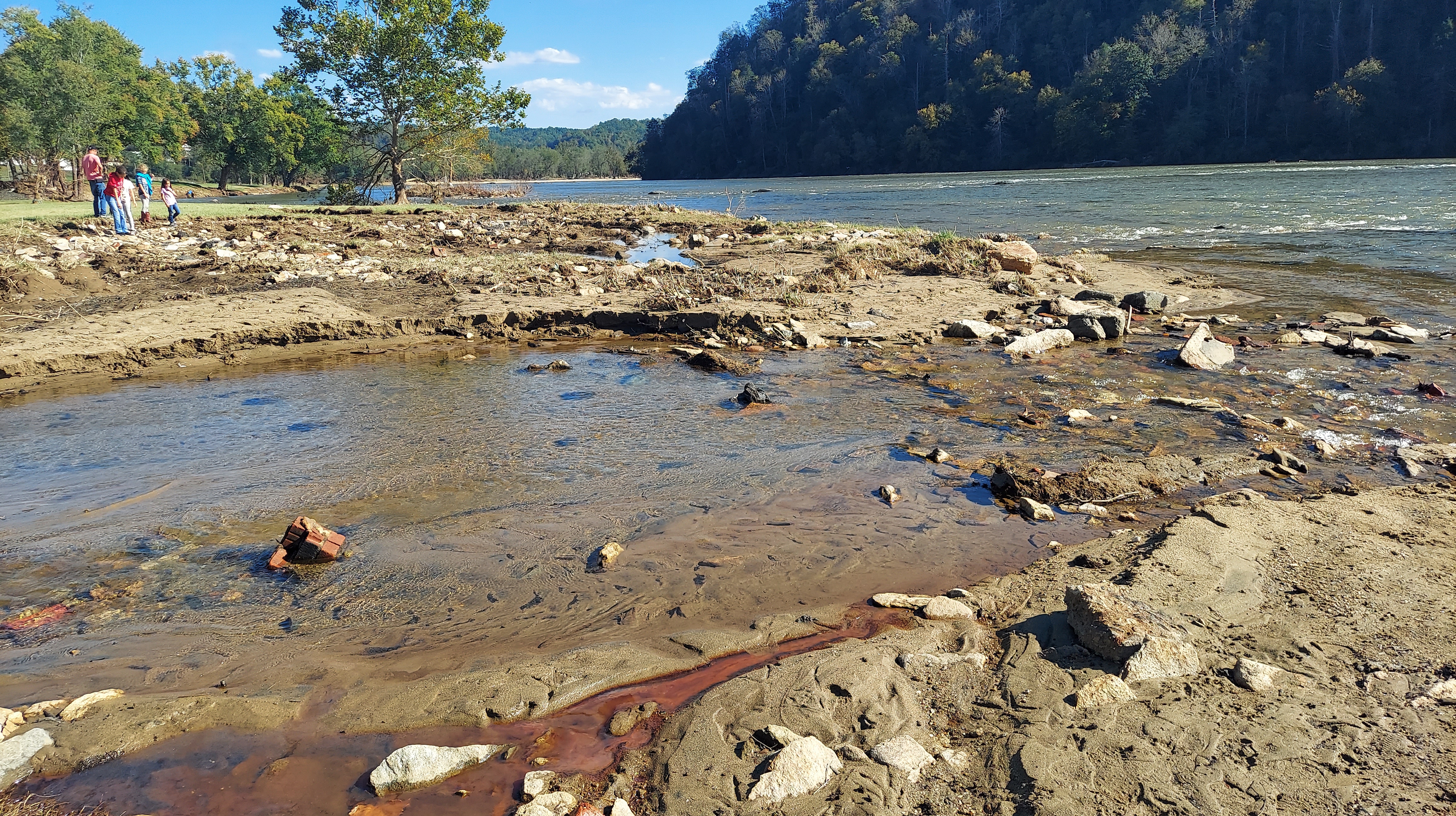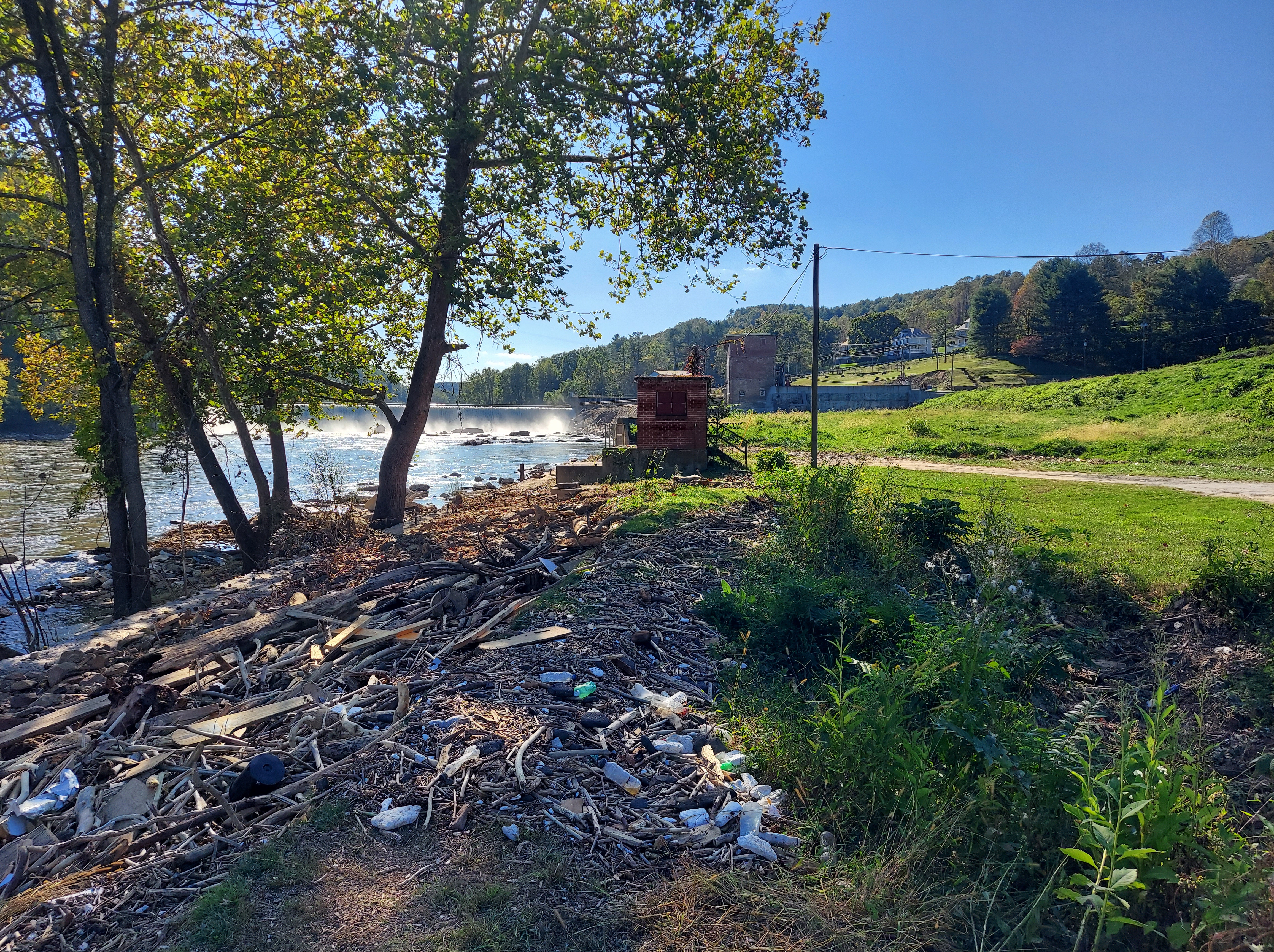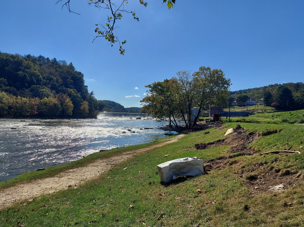 “There’s just… so much stuff…” a woman says to me as we pass each other on the new riverbank of sand, brick, wood, and rock where 10 days ago it was all grass. It’s a sunny, bright day, and the Fries historic mill dam is shrouded in mist. Adults and kids wander, observing what’s new. Bricks are scattered in shallow water. A crushed refrigerator lies by itself in the grass, feet from the shore. Above us all stands the wall built after the flood of 1940, protecting the town this time from the river’s torrent of rage below the dam.