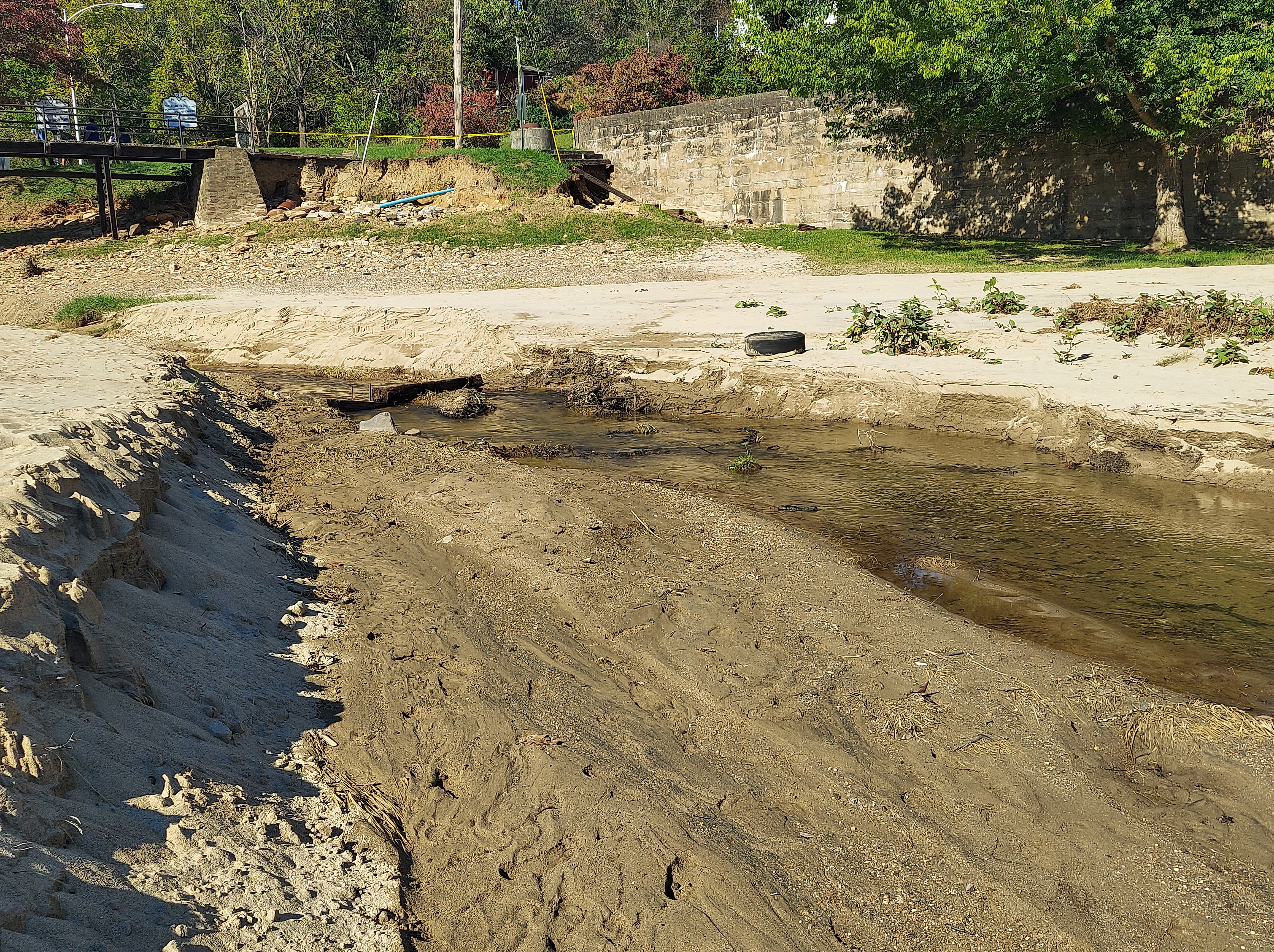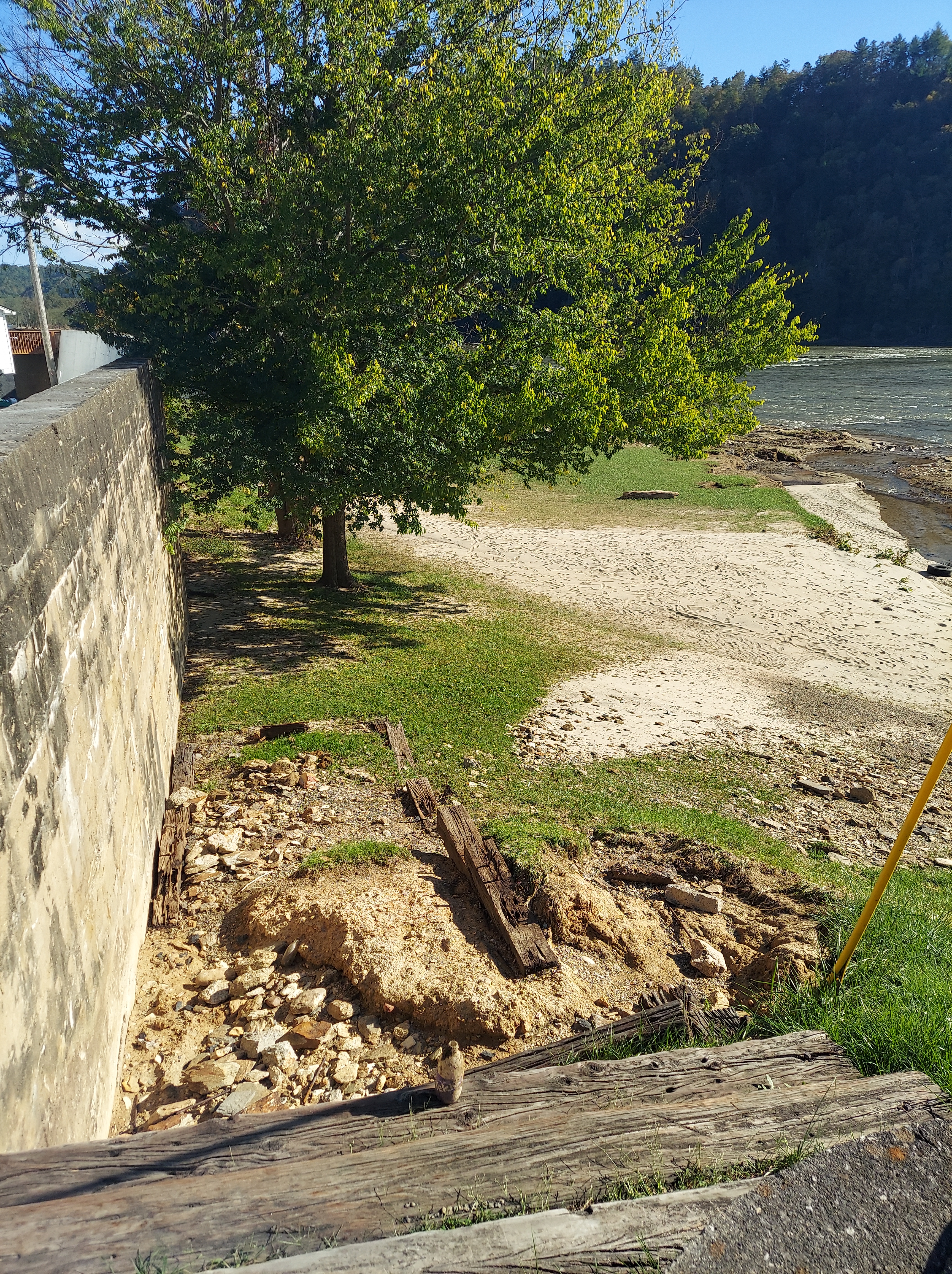 “There was a road here 10 days ago,” Mike Phipps, a Fries resident for 50 years, tells me as we stand on the remains of a lower wall on the riverside, looking up toward the dam. “It went all the way to the tailrace,” and now it’s gone. That giant rock sitting below the dam in the middle of the river, that’s new. The piles of debris show how high the river was, and “the water came about two-thirds high up that wall” [the tall one built after the 1940 flood]. During the past week, he says, people removed the canoes and other big things from the river that came over the dam. I ask him if he knows where the bricks came from; he’s not sure.