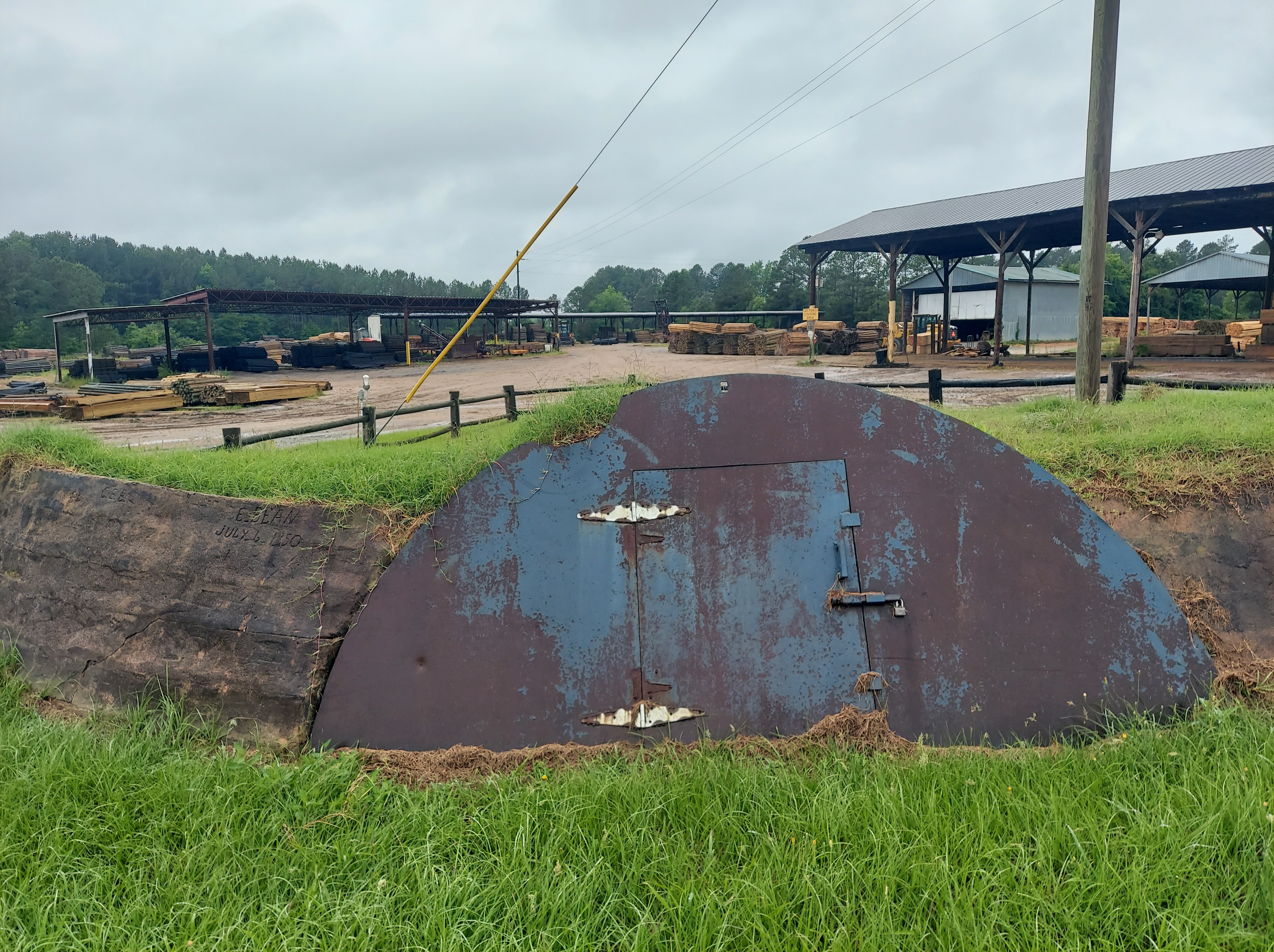 An owner of General Timber gives me a flyer about the 1925 disaster and answers some helpful questions that I have. She says the sawmill uses the water pump from the mine, so they covered the entrance with a locking metal door. To the left of the door, I notice a name & date carved in the stone: “E. BEAN JULY 6, 1850.”