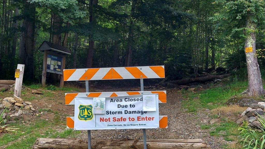 At the access to the mica mine stands a sign, “area closed to storm damage/not safe to enter.” Fallen trees and rocks rolled by nature can be seen. This is my first trip to western NC after Hurricane Helene.