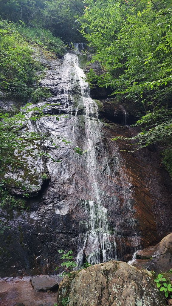 Next, beside Ellijay Rd is thin, tall Katie’s Falls, named for Katherine Allen Moore Rhinehart by her father (note the memorial sign). I enjoy my first visit to this fall in shady solitude. It’s a little cooler at this higher altitude.