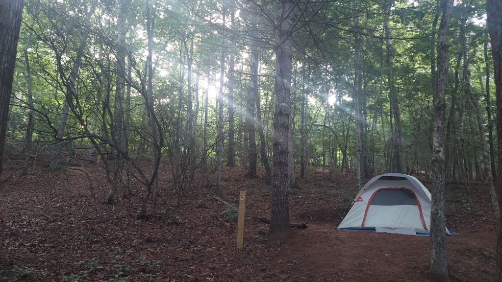 I set up camp at Cowee Campground, part of Sheffield Gem Mine, which is owned by a friend. It’s in lush Cowee Valley, north of Franklin, in a historic ruby mining area. The campground is about a year old, and there are sites for tents and RVs, as well as a cabin. There is a beautiful wooden bathhouse (with showers) and a nearby deck with a sitting area underneath it. It’s a hidden place away from human civilization, but known to wildlife (not bears, though) and cows are nearby.