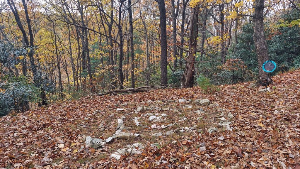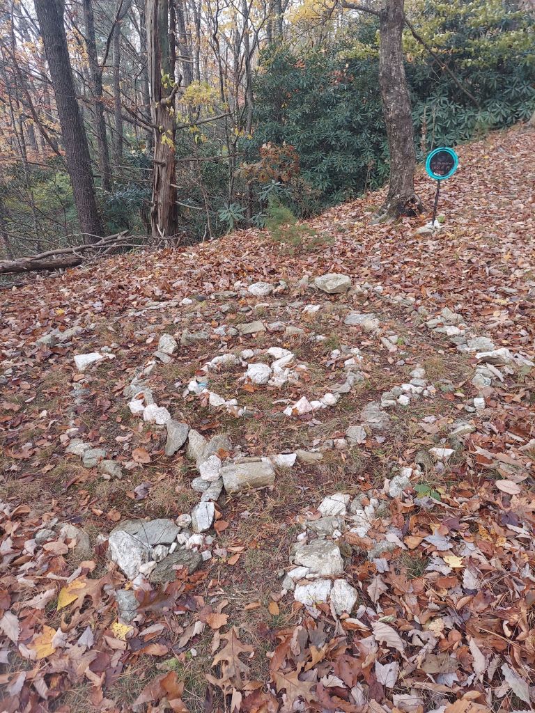 In the clearing, leaves cover the stone labyrinth and the metal memorial sign has fallen. After a time clearing and fixing these, I walk the labyrinth twice with a song.