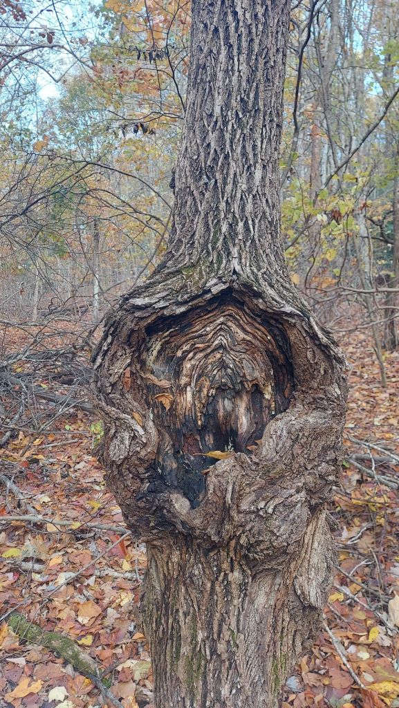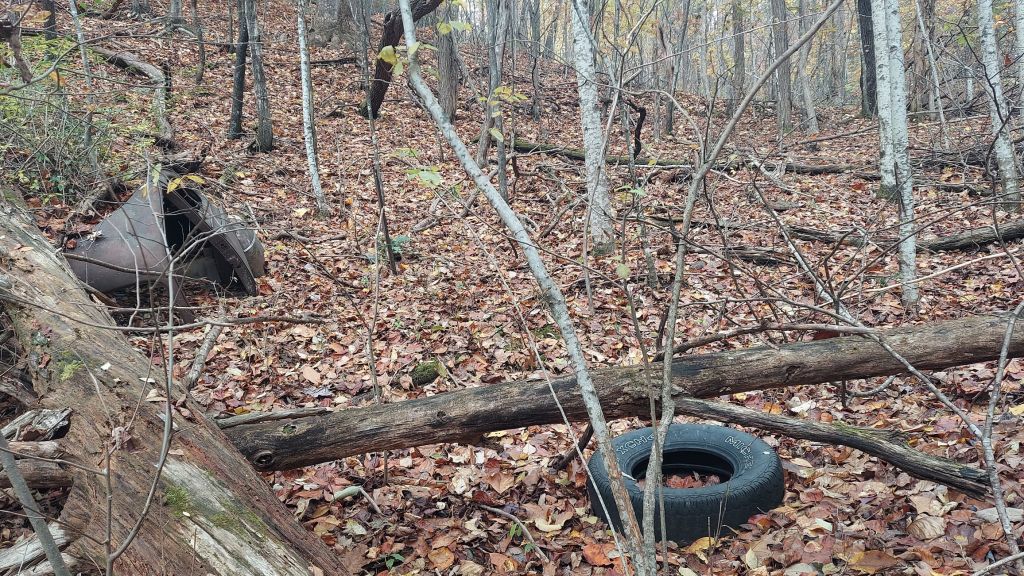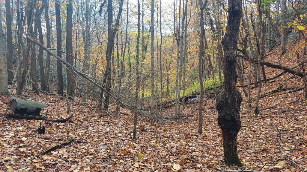 In the holler, I visit the Grandfather Tree, the homestead ruins, and the spring. The spring is nearly dry; the bottles are mostly moved or missing; and a newish tire now sits by the old car and a fallen tree. No other humans have walked here, so besides a storm’s effects, these remain a mystery.