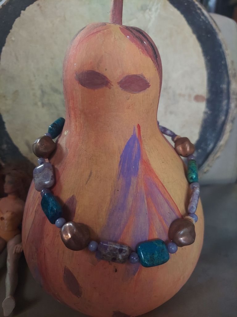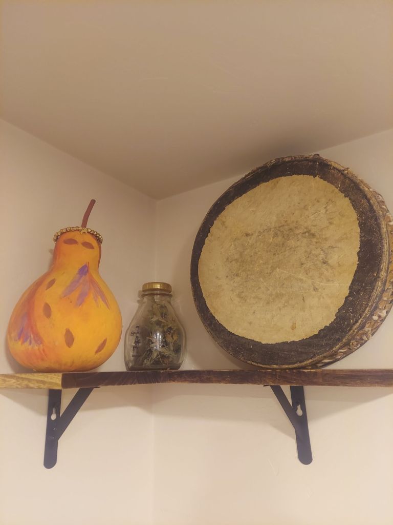 At her house, I recover as my friend and I reconnect and share memories. Her two young daughters play in the backyard, and I interact with them, too. The hide hand drum and goddess gourd have found a new home, here.