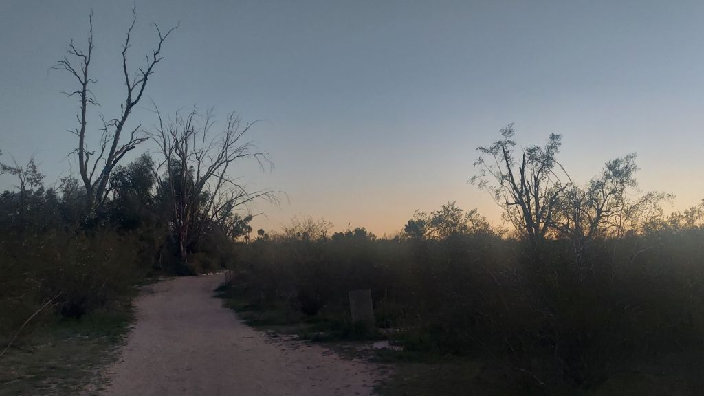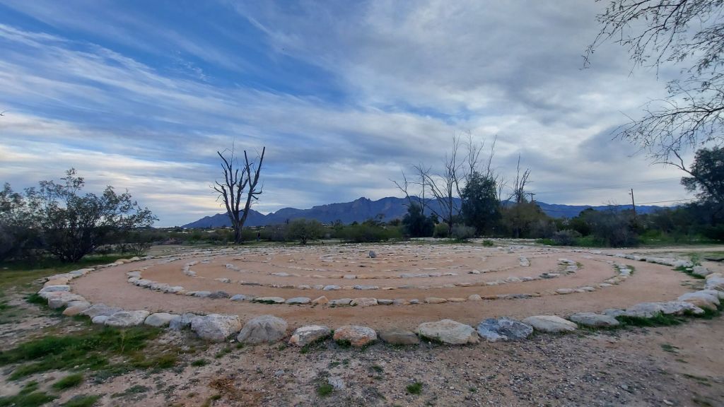 It begins hopefully enough on my arrival. The desert air is cool, not cold, with a little breeze. A warm, bright, sunny day follows, and I bask in the sunlight in the nature park among the creosote bush, mesquite, and the rocks of the big labyrinth.