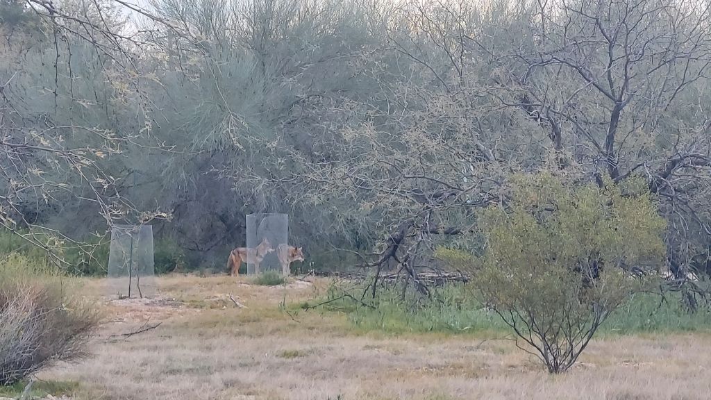 At a crossing of paths, here is a crossroad in life. Coyote appears as a trickster and catalyst in folklore of many Indigenous cultures (including local Tohono O’odham); so fitting that these coyotes are my companions here, guiding me toward the unknown day.