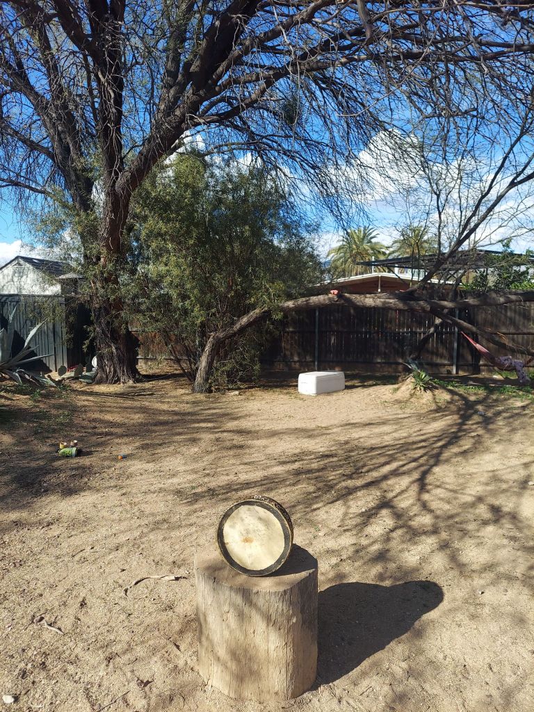 Three young coyotes walk ahead on the path, then run into the thick bushes. Later in the afternoon, I walk to a drum circle in another part of this park. I use my hide hand drum that stays here at my friend’s house. It’s a drum with a journey — made in Africa, purchased at Ten Thousand Villages here in North Carolina, given to me as a gift, then I bring it to Arizona in 2011 by cross-country road trip. It gets played a lot, then warped (possibly by being crushed when I was camping); I get a new, sturdier drum in Perú, which I decorate and it becomes my primary drum. My older drum, left to storage, prefers the desert climate. When I visit Tucson annually for gem show, it comes out to play.
