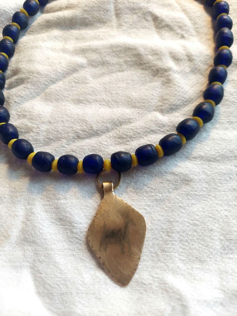 My other friend and I agree to meet again and follow through with an earlier plan. As we walk through the African Art Village, among quiet merchant rows, the prevailing feeling is somewhat somber, knowing it’s been a slow show. We get a strand of blue-glass beads, which will be used in a necklace I’m currently assembling.